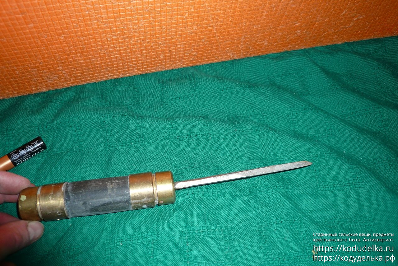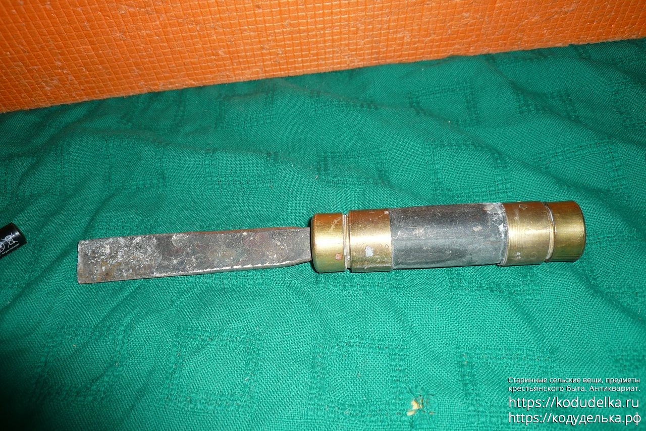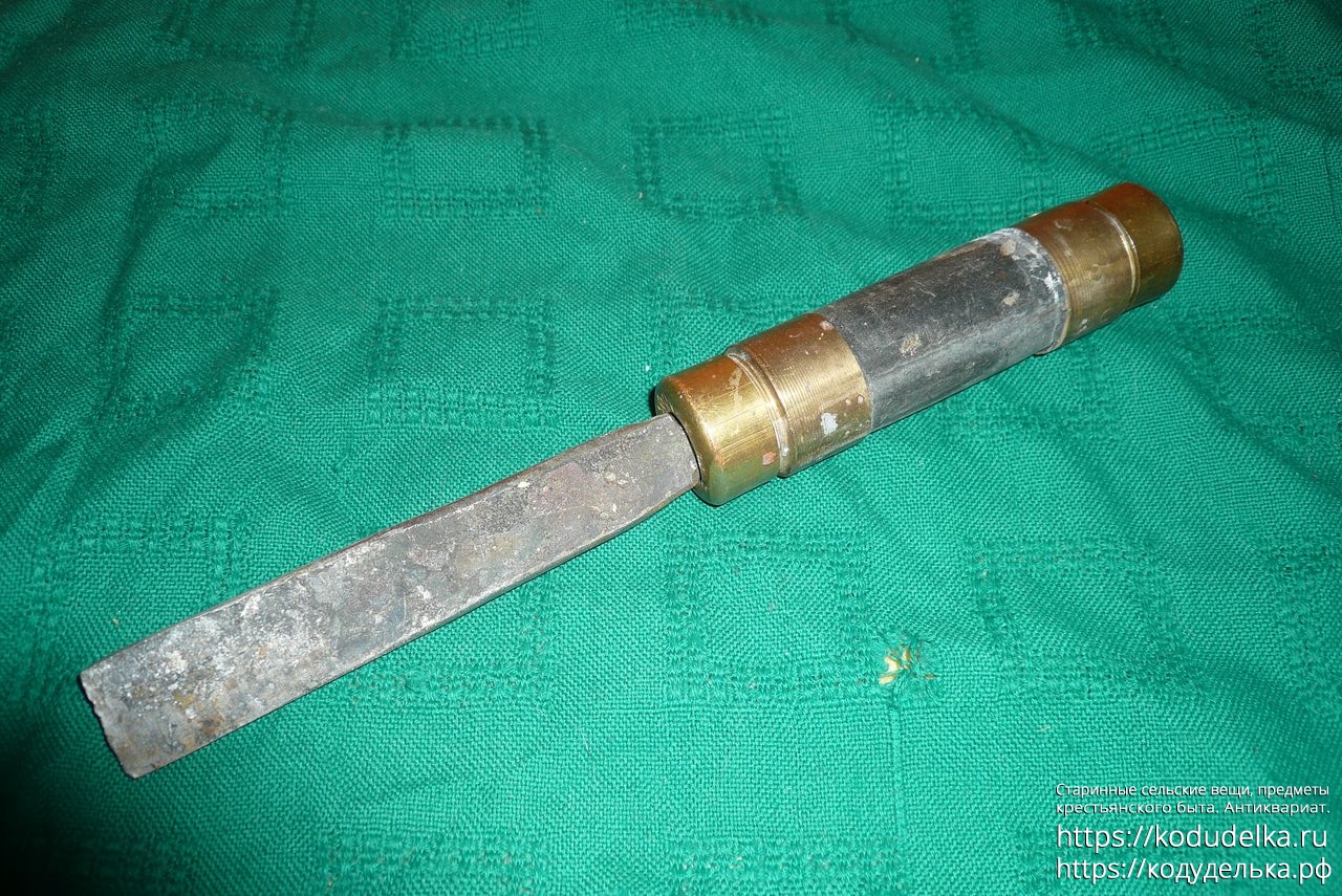 Первая — с латунной ручкой, отдалённо похожа на элитную (главным образом из-за ручки), при этом сама стамеска в печальном состоянии — во-первых, сточена (хотя такое, наверное, правится при электро-заточке), во-вторых -лезвие отклонено по горизонтали относительно ручки (вот тут уже сложнее, хотя через тиски,п ри нужной сноровке, наверное, можно выпрямить.
