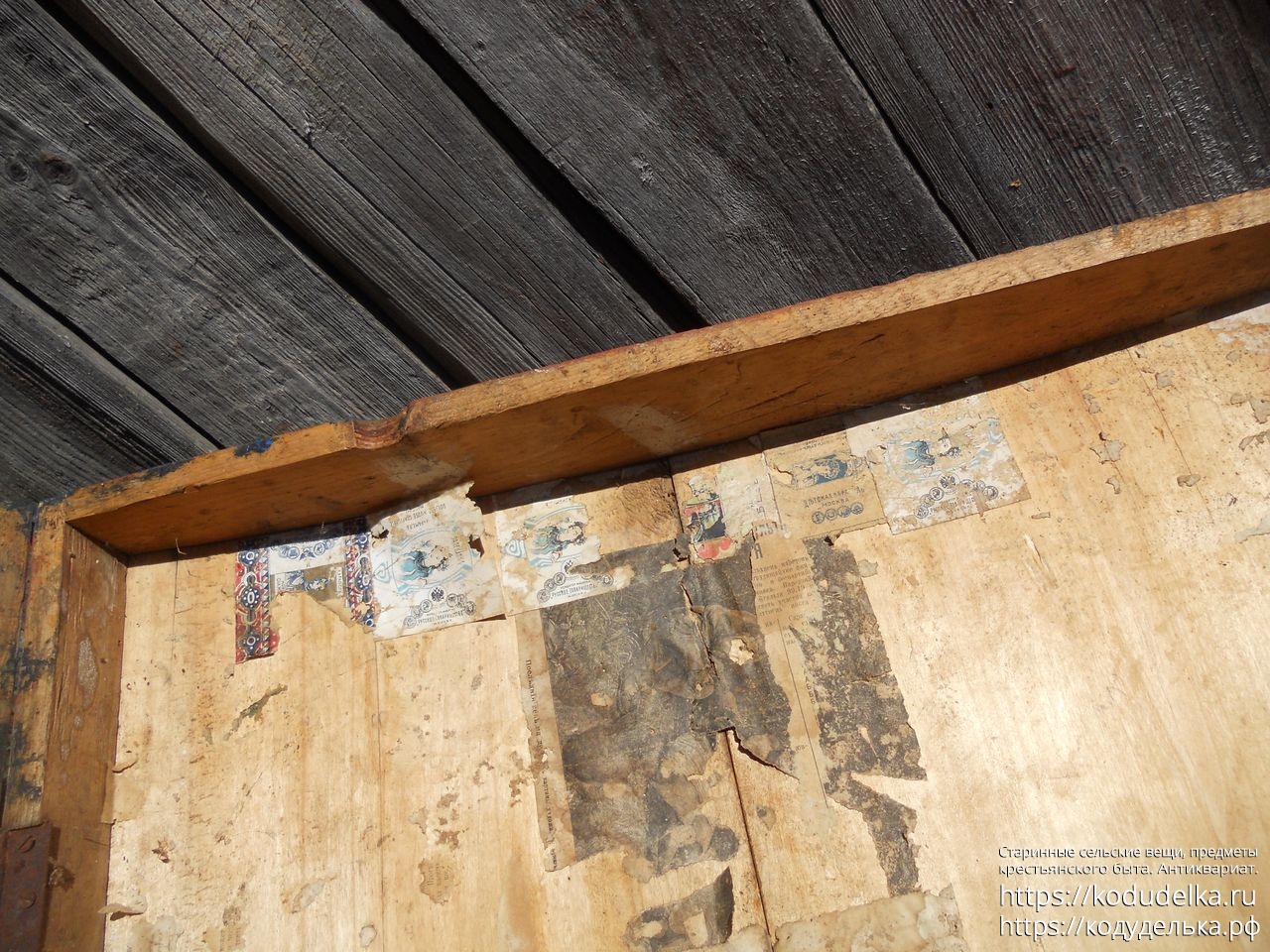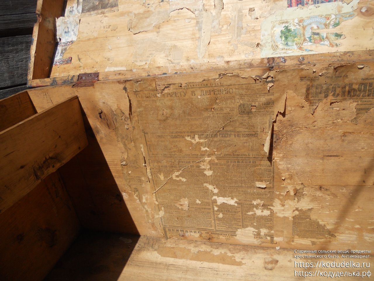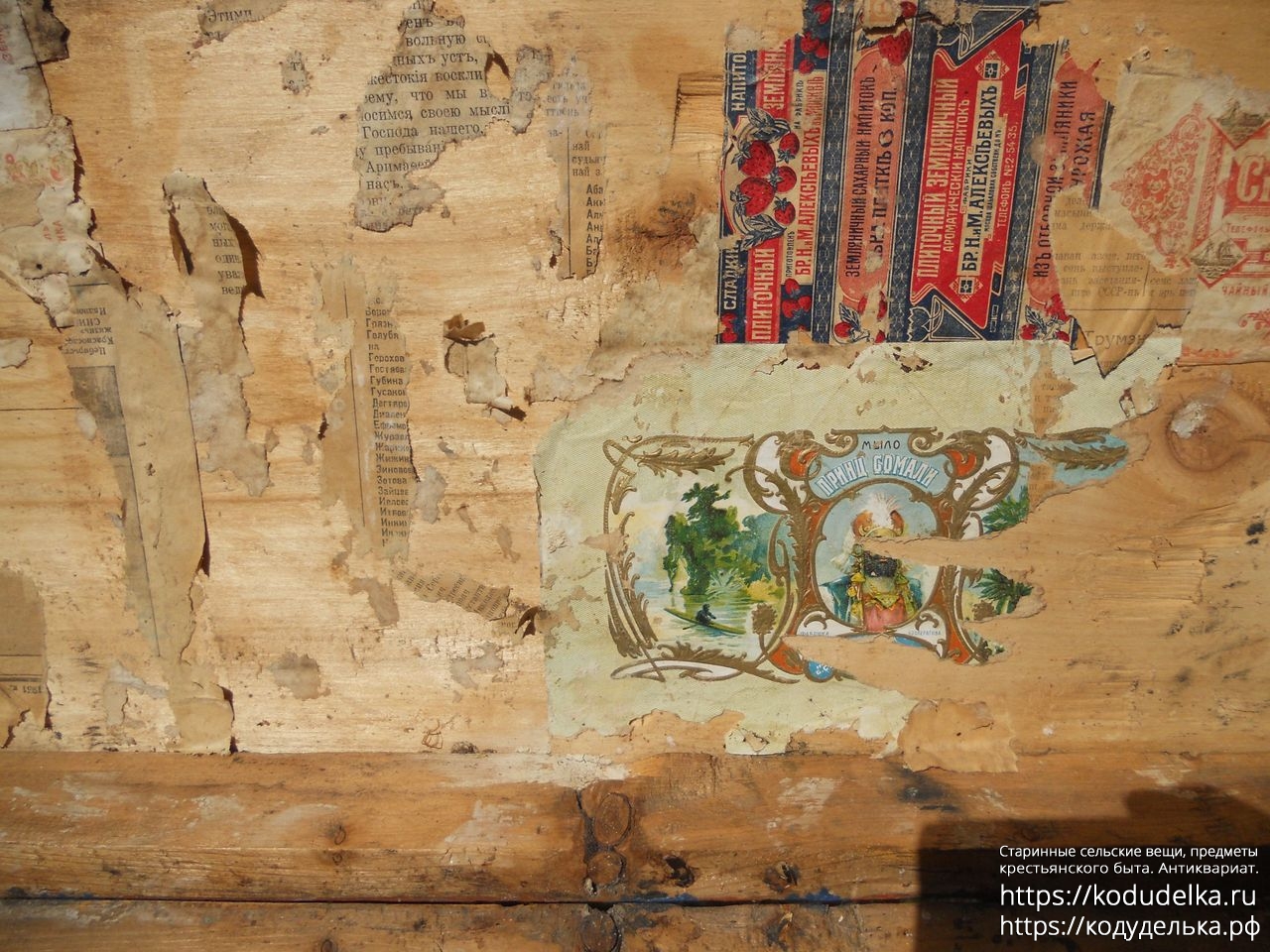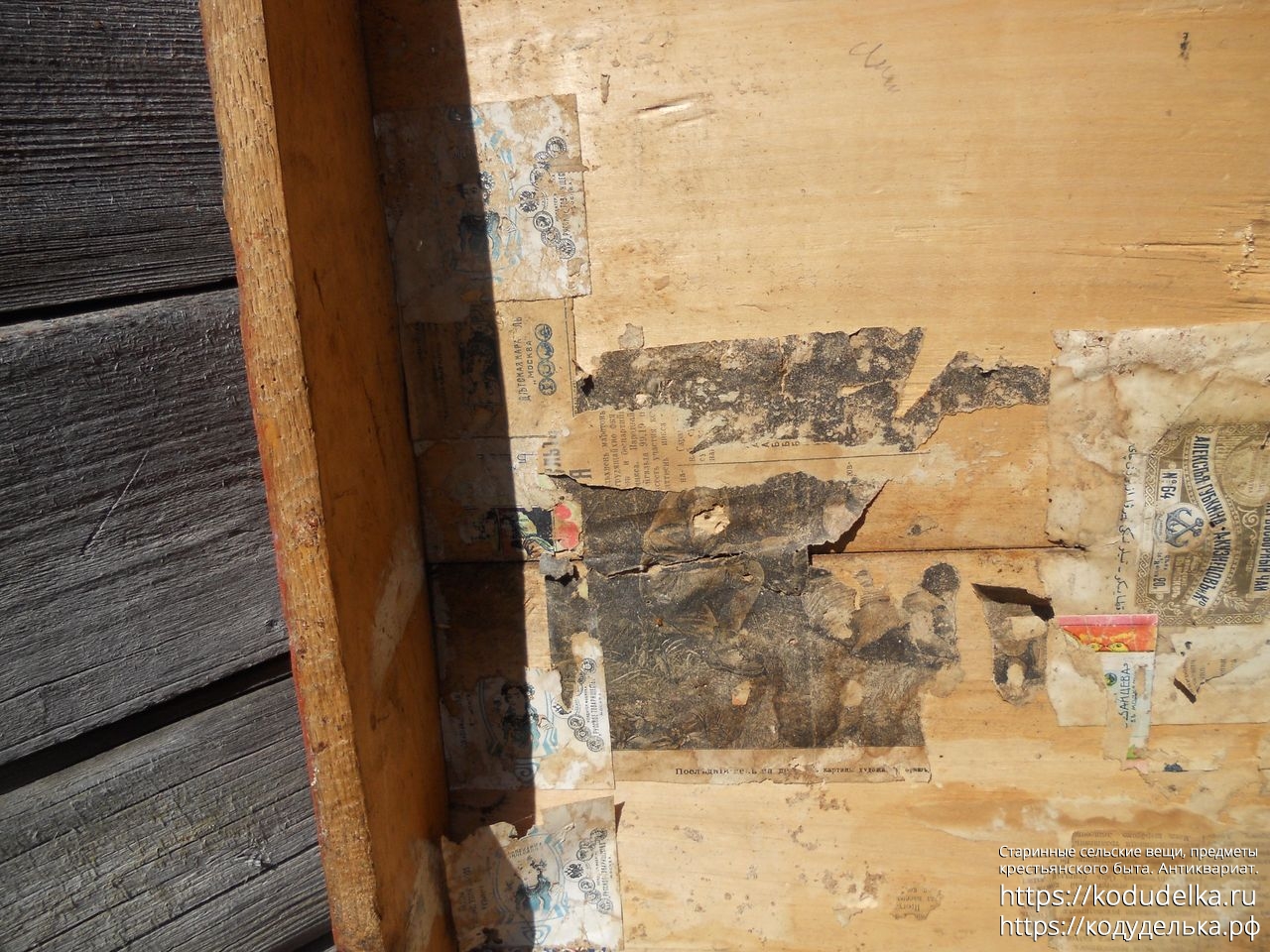 Крышка изнутри оклеена дореволюционные упаковками от мыла, чая и проч., бока частично обклеены советскими газетами.