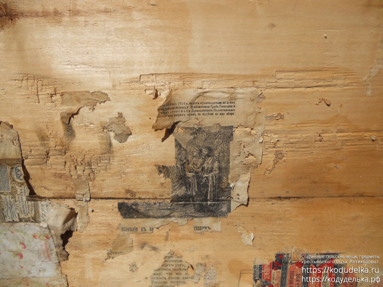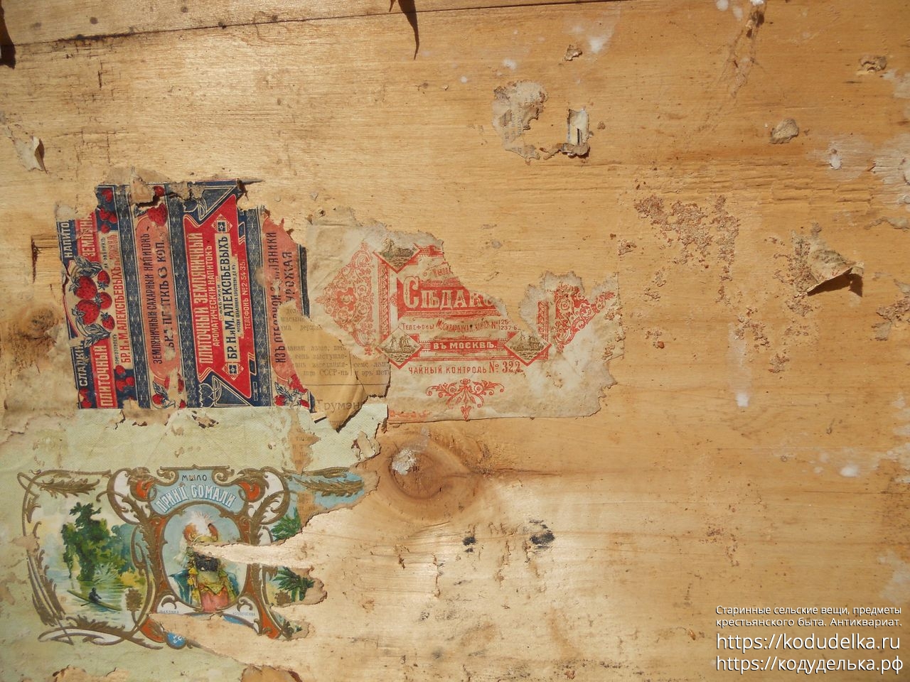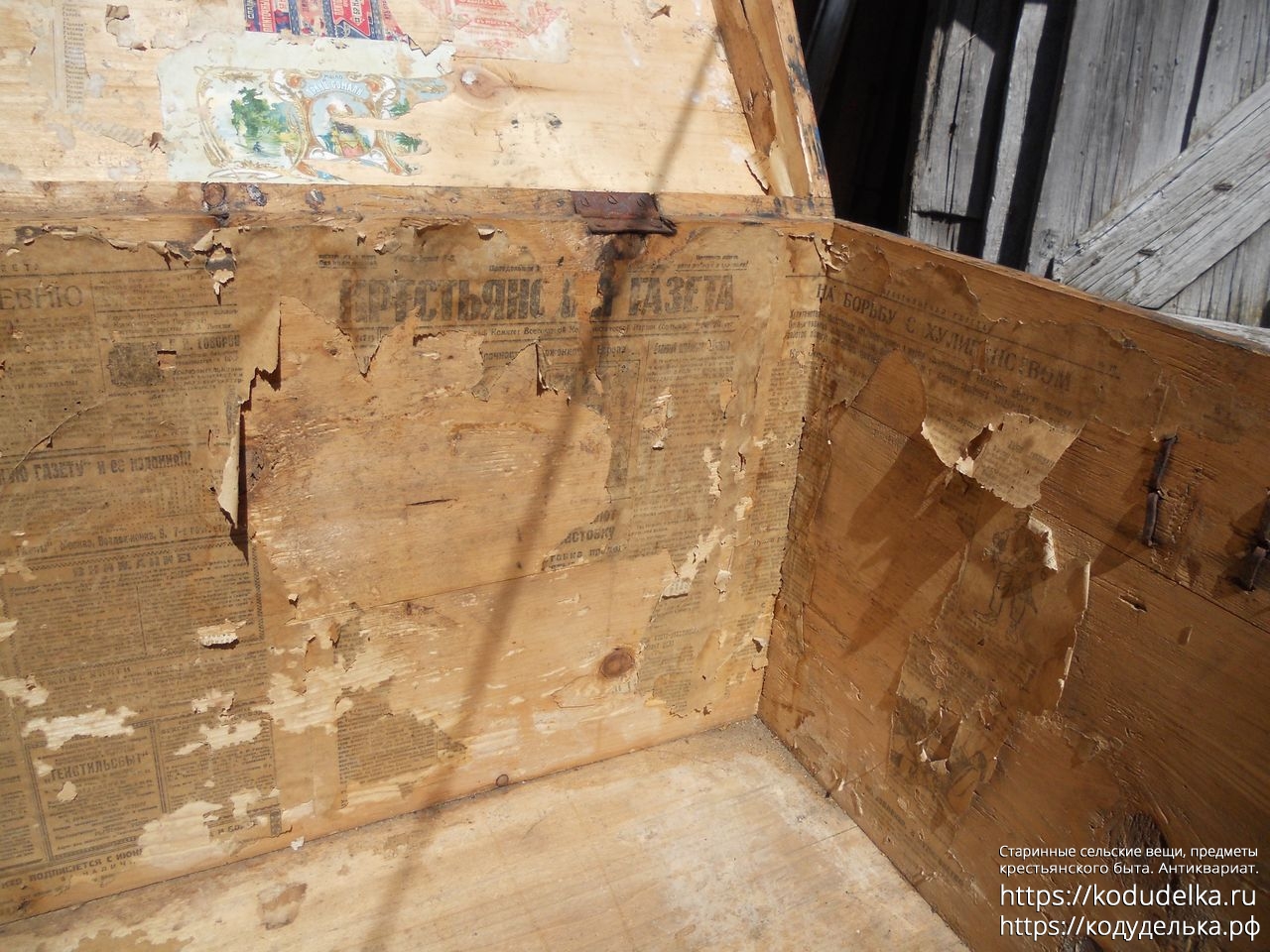 Крышка изнутри оклеена дореволюционные упаковками от мыла, чая и проч., бока частично обклеены советскими газетами.