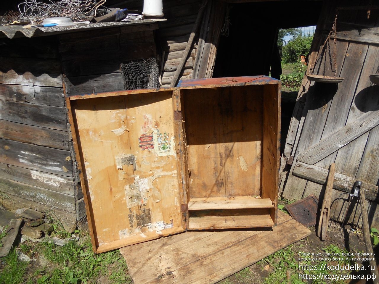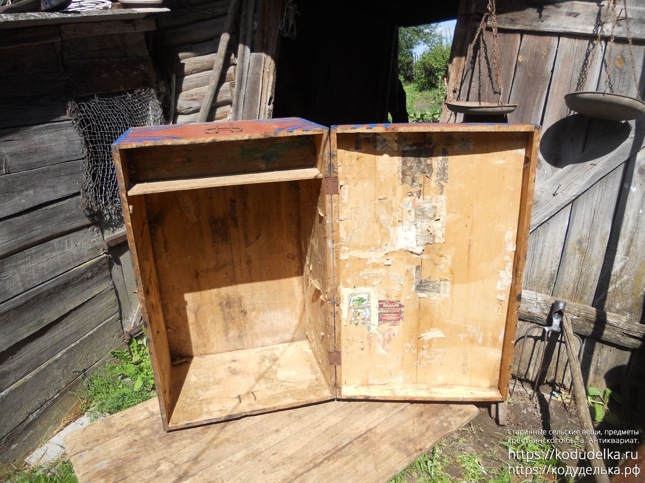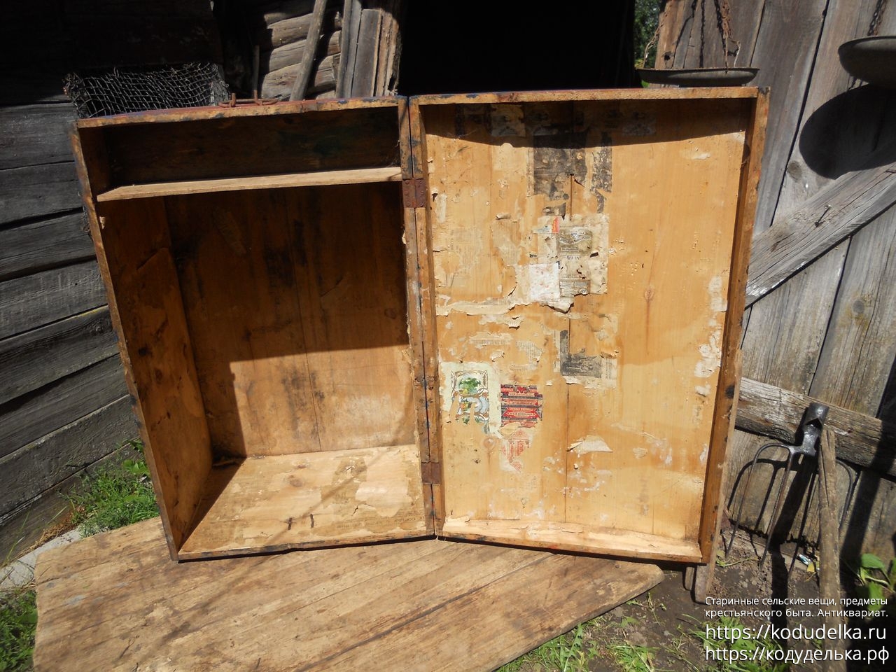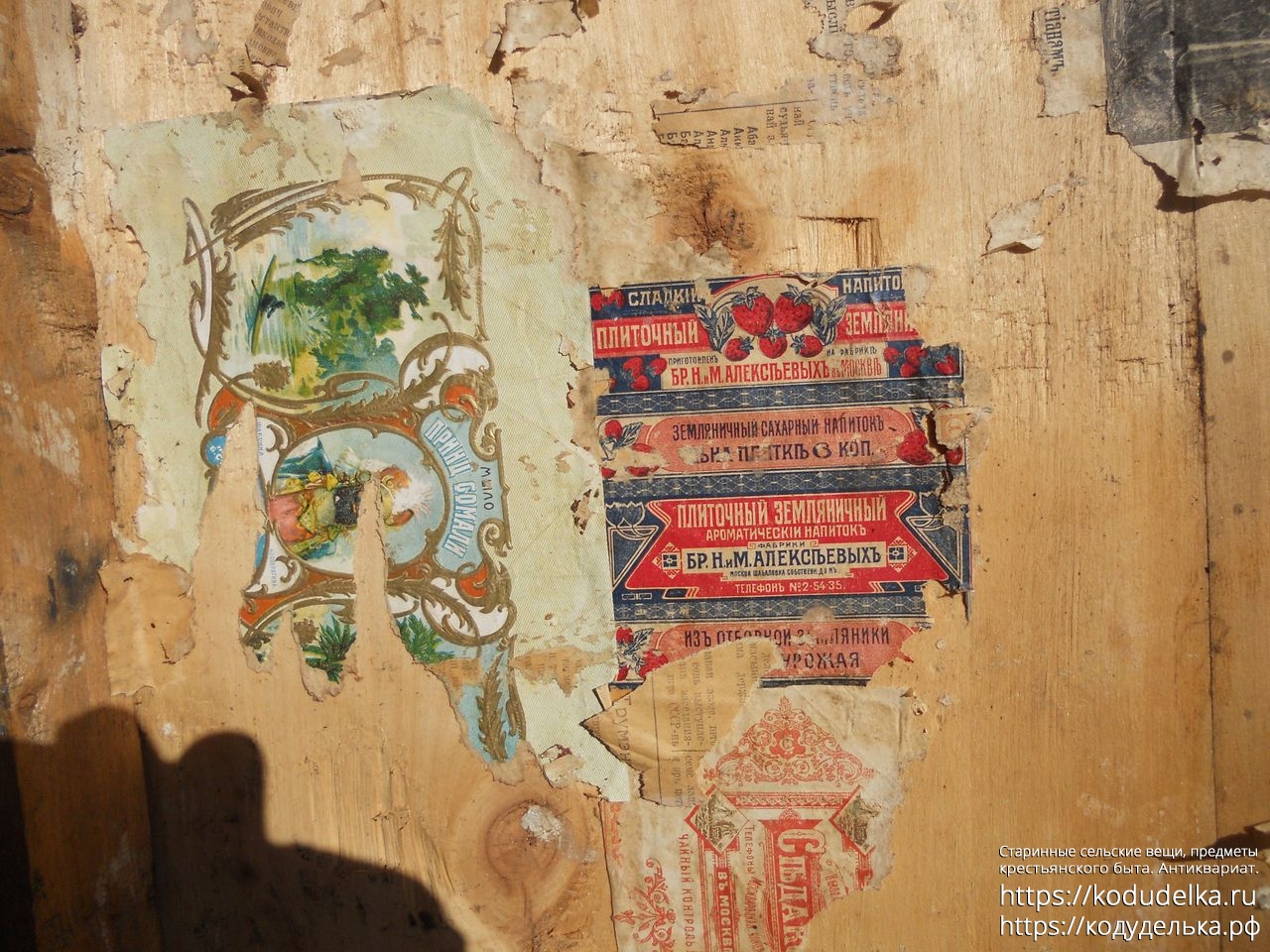 Крышка изнутри оклеена дореволюционные упаковками от мыла, чая и проч., бока частично обклеены советскими газетами.