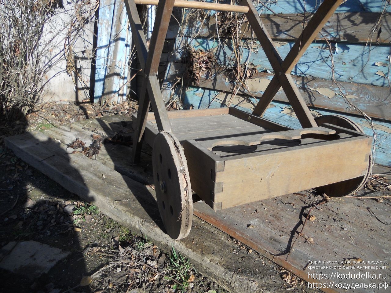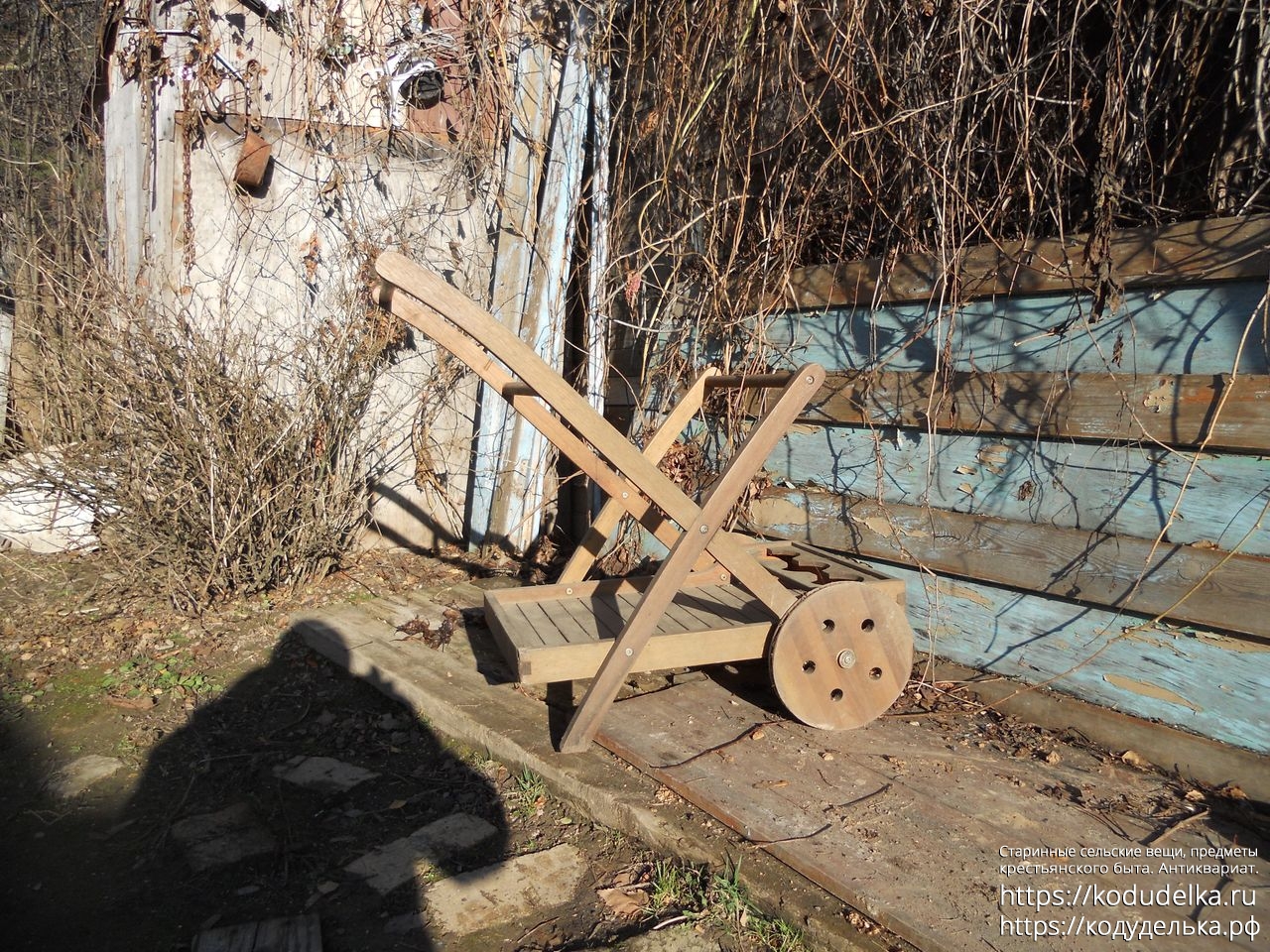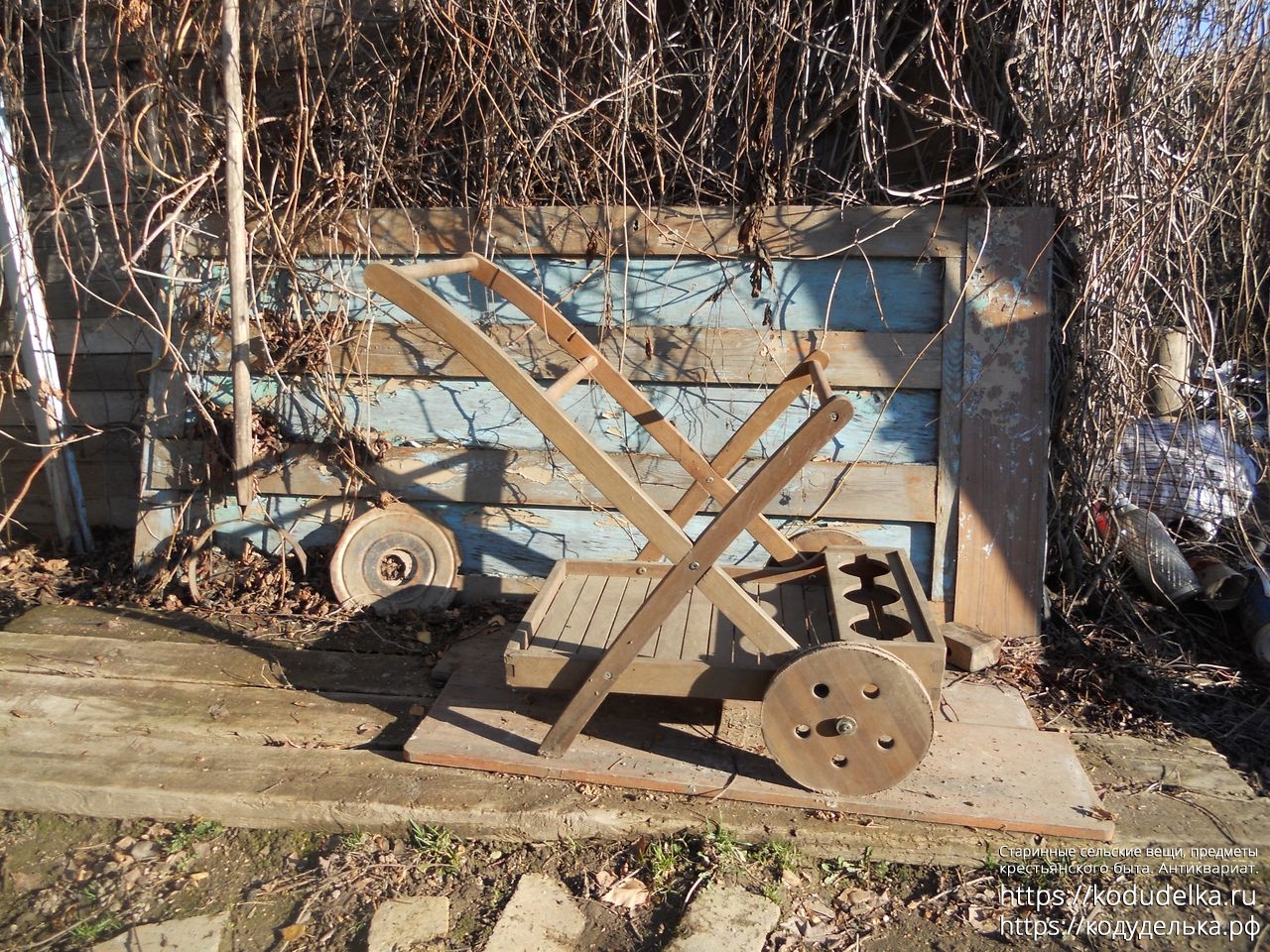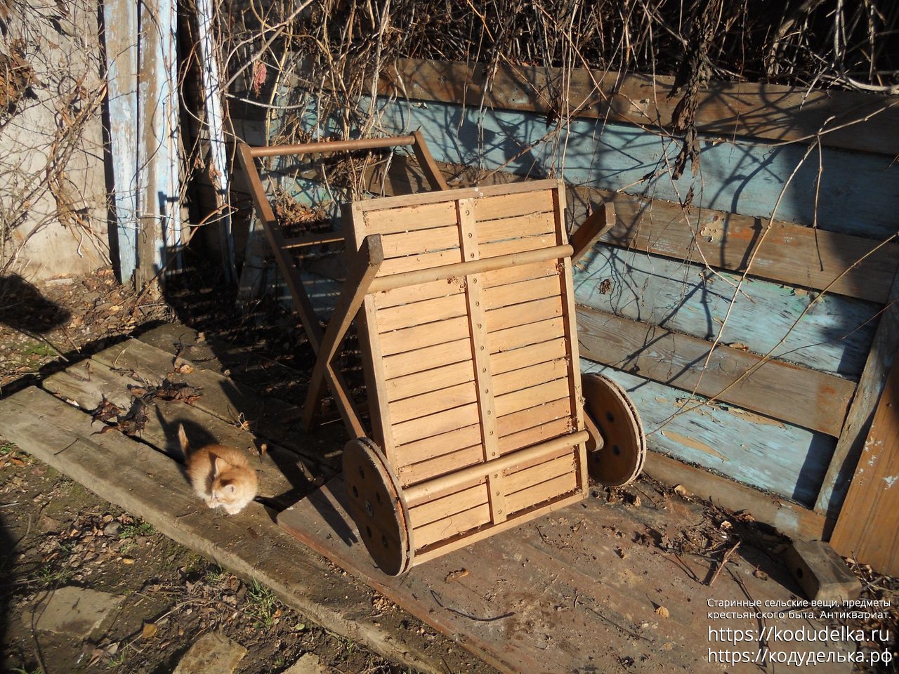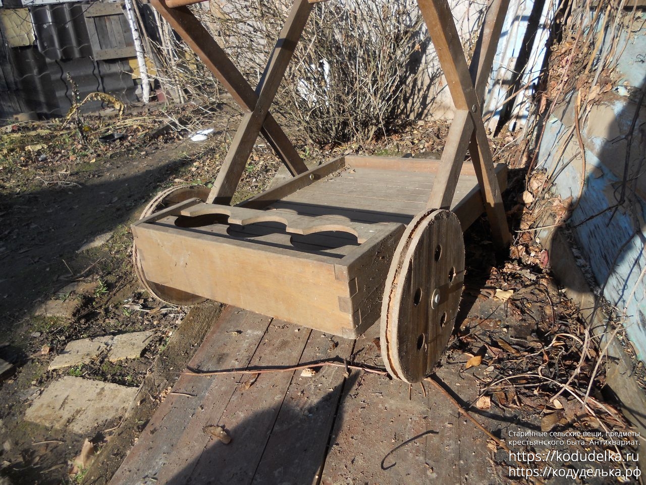 Современная деревянная тележка, такие ставят в парках, на приусадебных участках, на выставках и т.п.