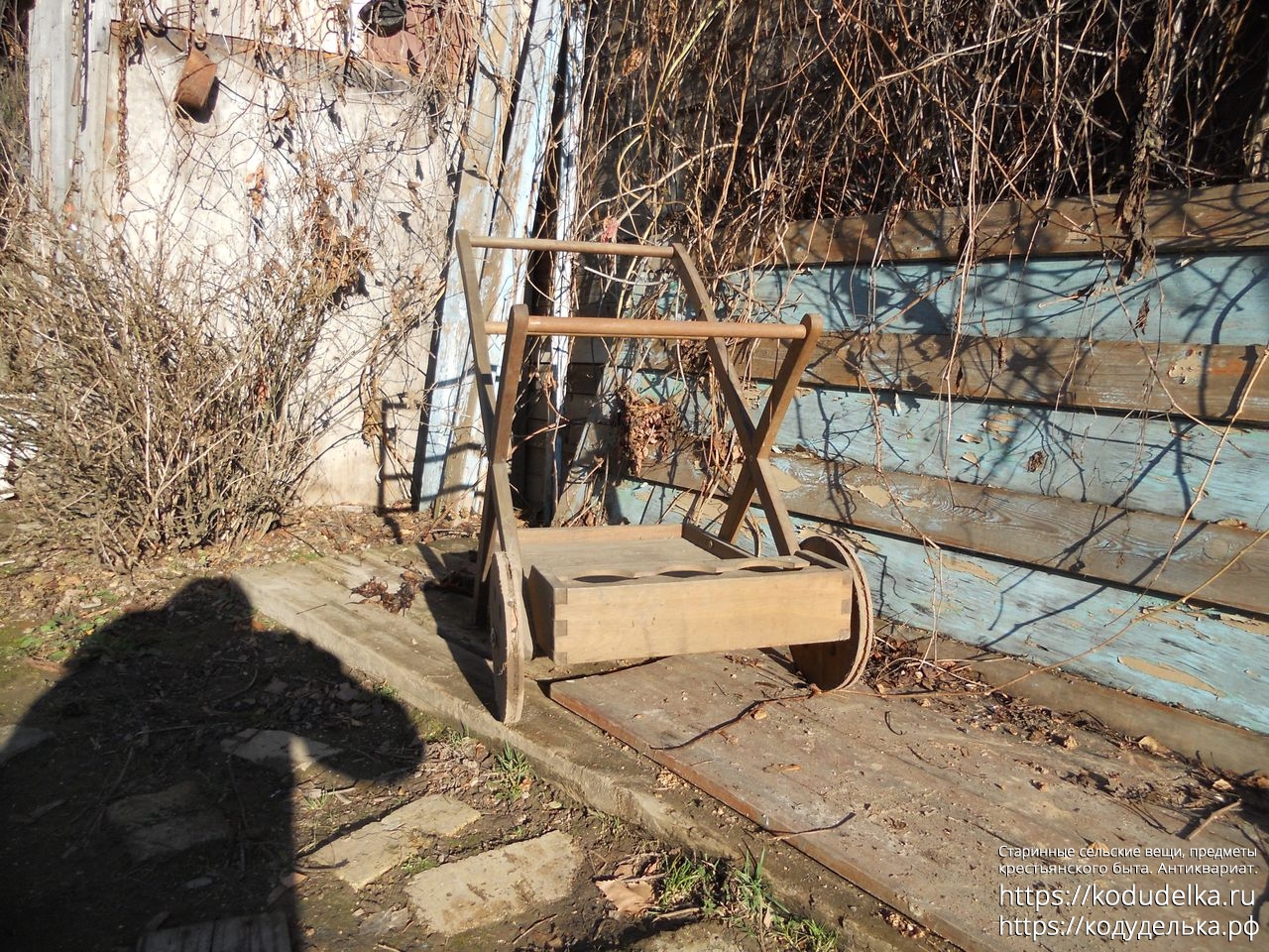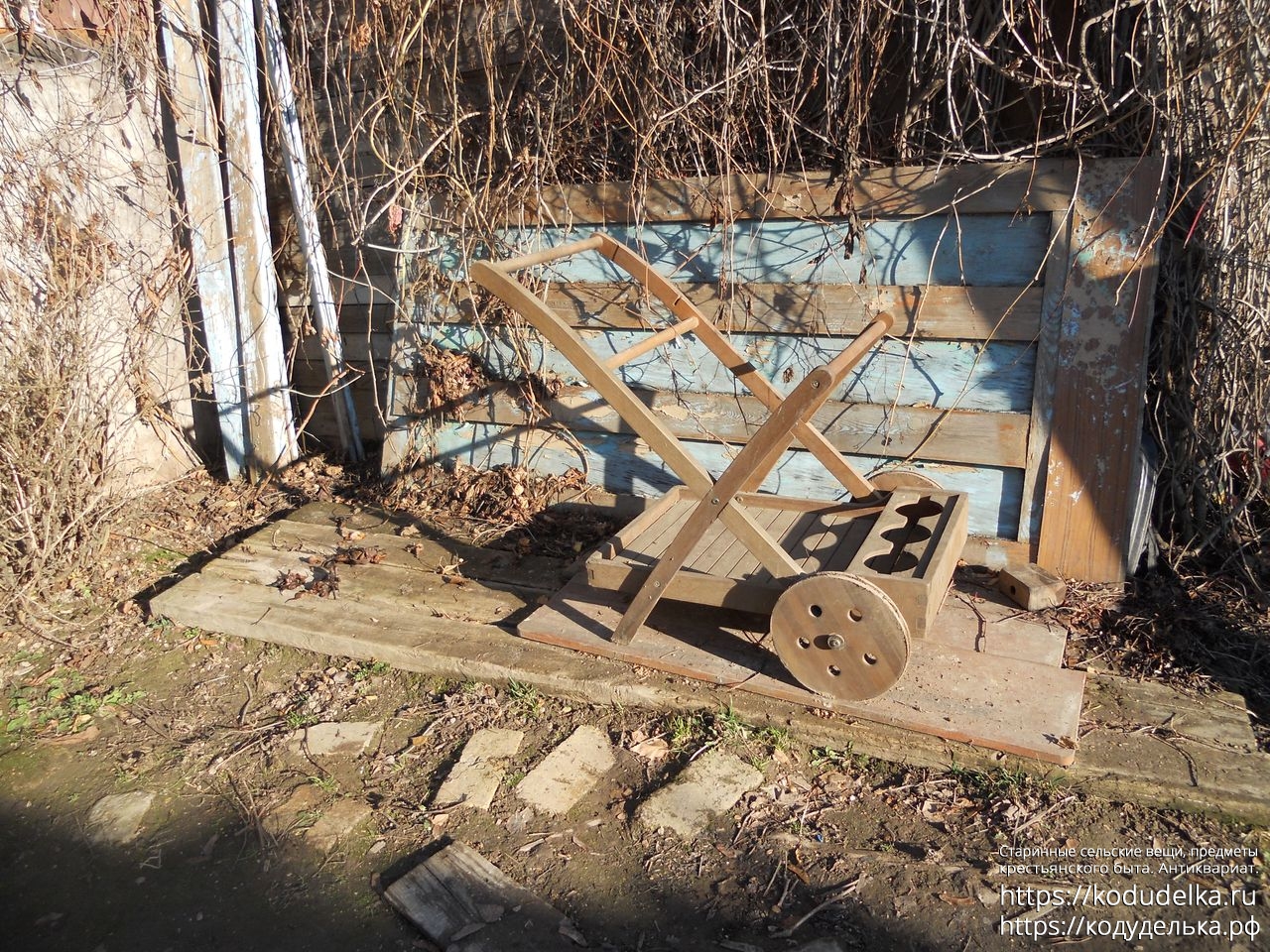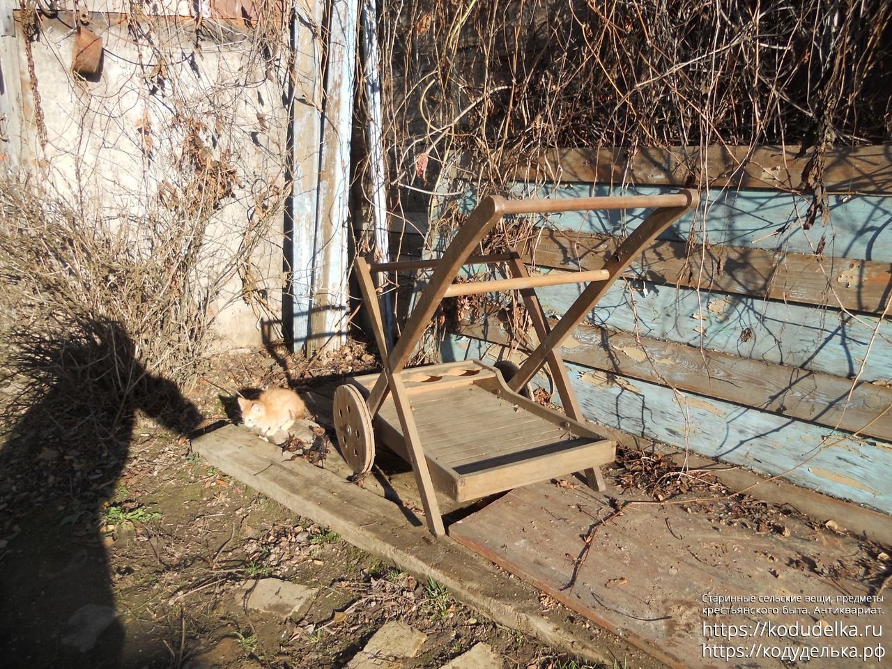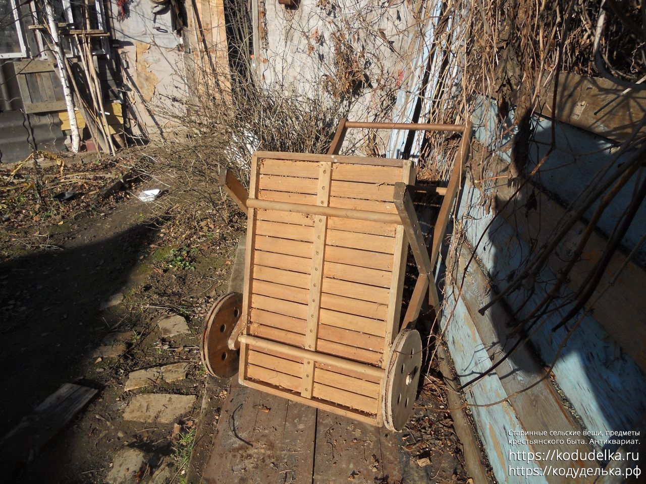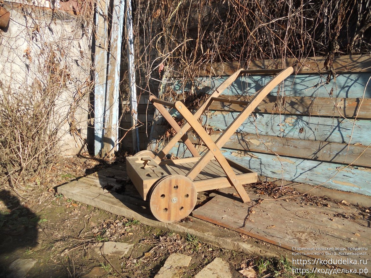 Современная деревянная тележка, такие ставят в парках, на приусадебных участках, на выставках и т.п.
