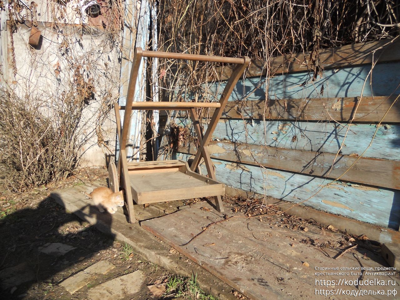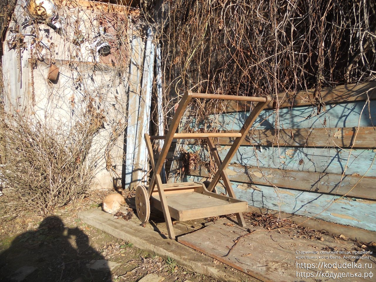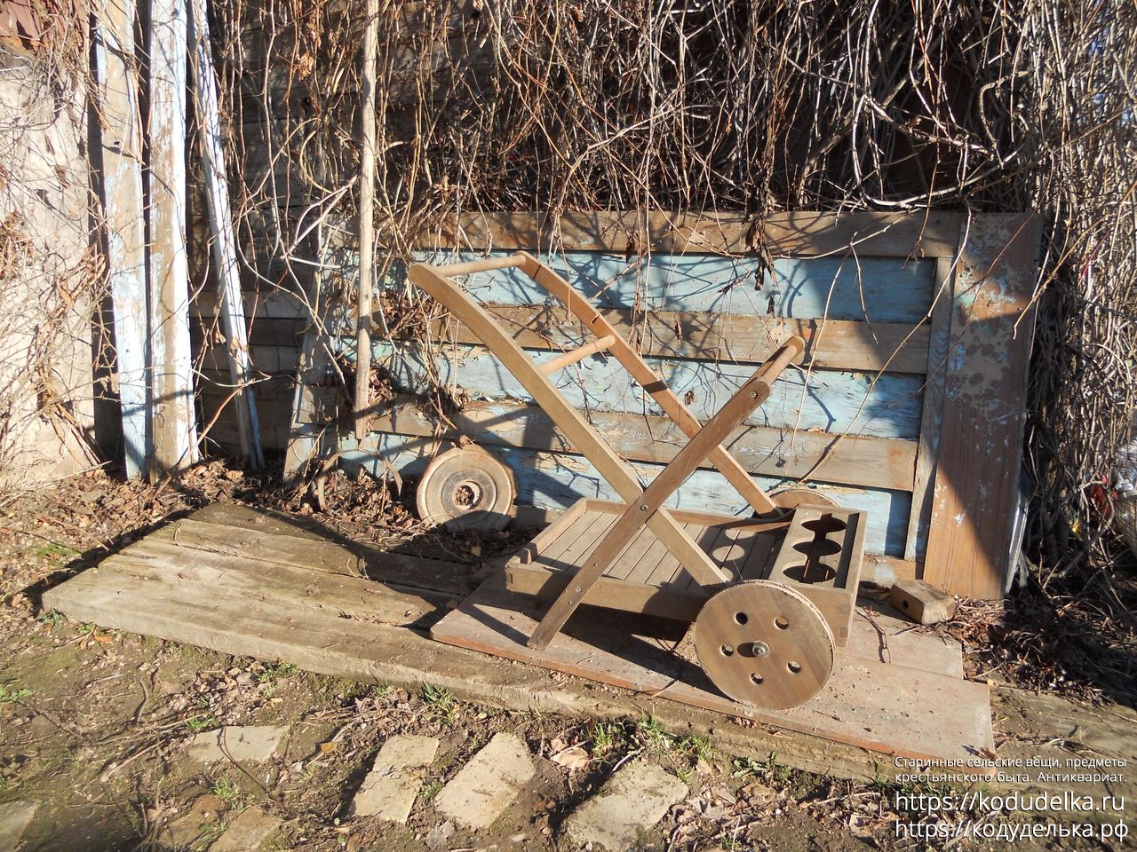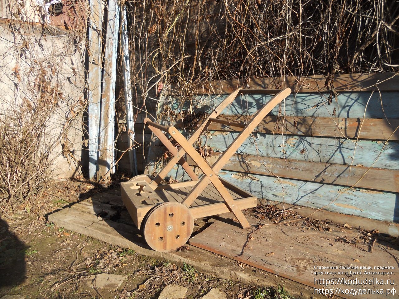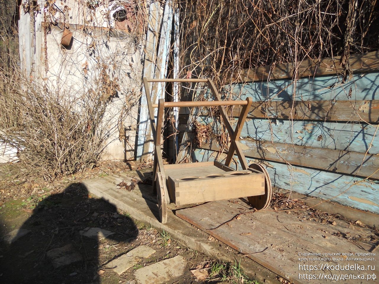 Современная деревянная тележка, такие ставят в парках, на приусадебных участках, на выставках и т.п.