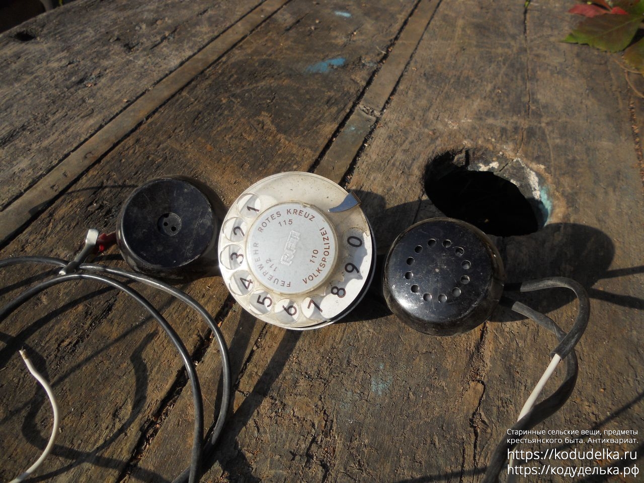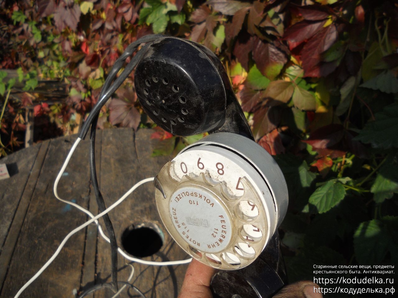 Надпись на телефонном диске: FEUERWEHR ROTES KREUZ VOLKSPOLIZEI 110 112 115 (немецкий язык, надпись переводится как ПОЖАРНОЕ ОТДЕЛЕНИЕ КРАСНОГО КРЕСТА НАРОДНАЯ ПОЛИЦИЯ)