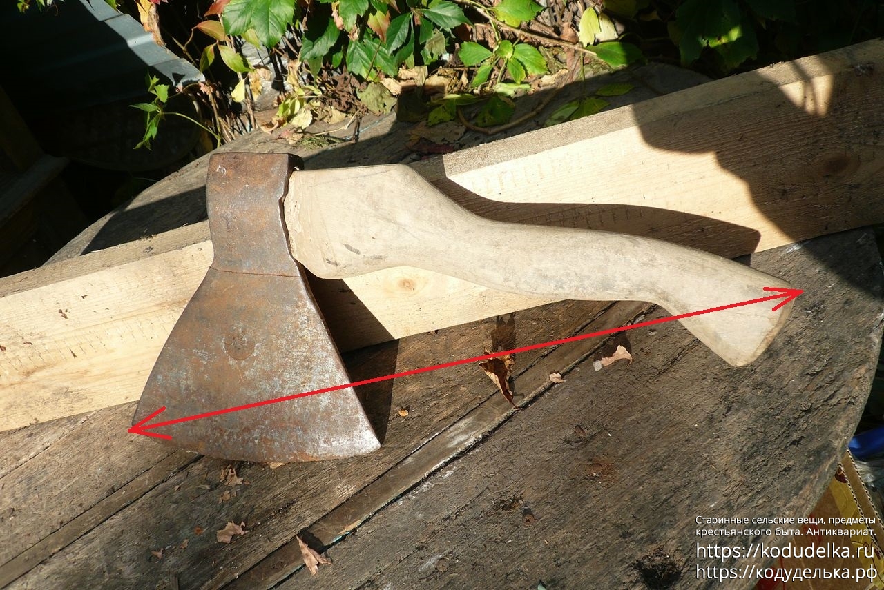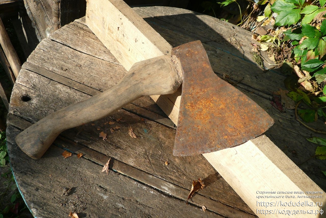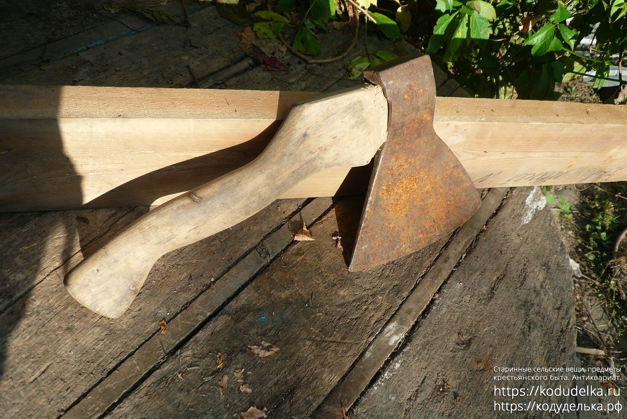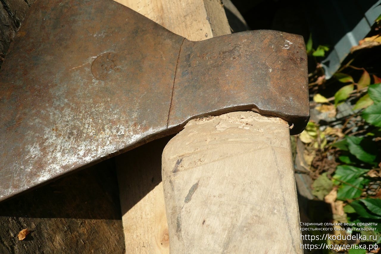 У самого топора трещина на щеке с одной стороны, топорище обстругано на уровне «так себе» — лишь бы влезло — и НЕ расклинено.