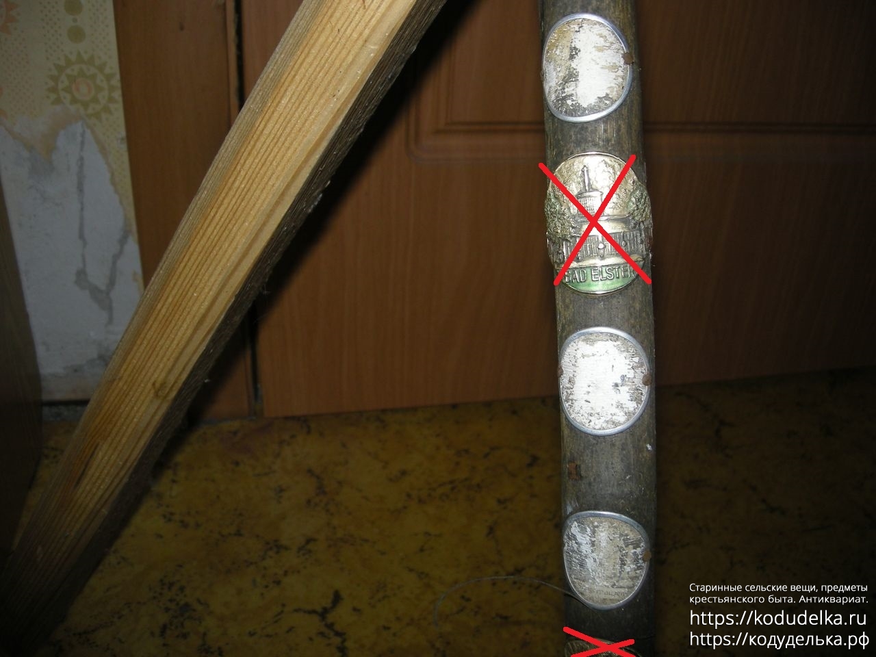Трость, возможно из ГДР, деревянная, с накладными шильдиками-жетонами.
