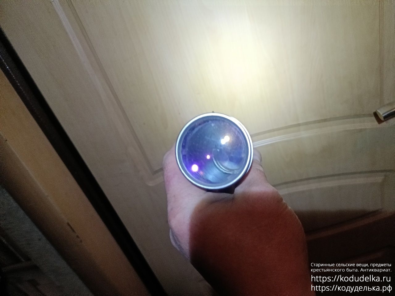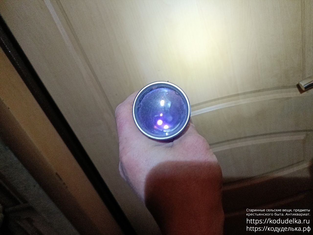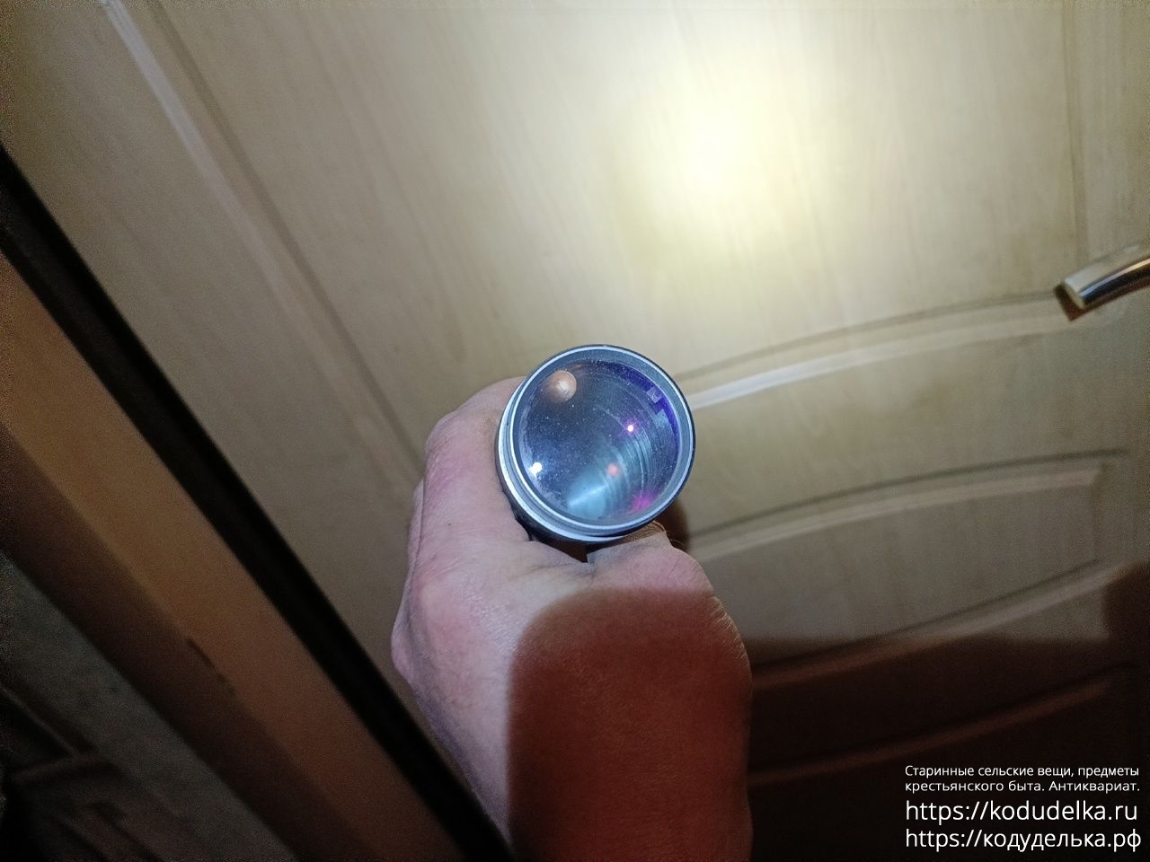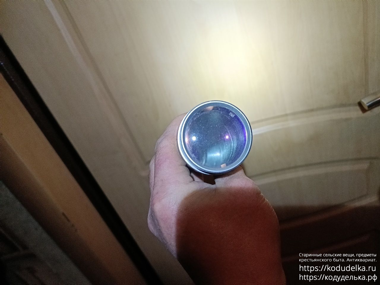Навскидку — большая линза (где широко) — целая, без трещин и царапин. А вот малая, где узкое — там стекло повреждено (поцарапано? или покрытие сошло неравномерно, может, залито чем-то. Непонятно в общем, но через него ничего не видно). Цена дана с учётом повреждения.