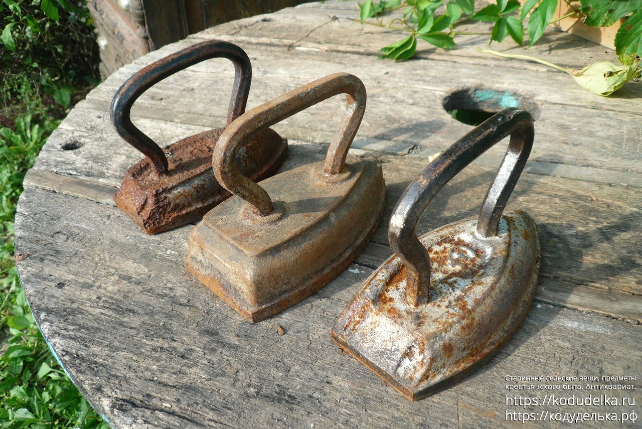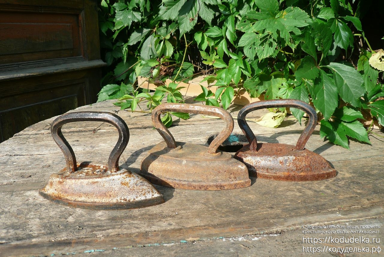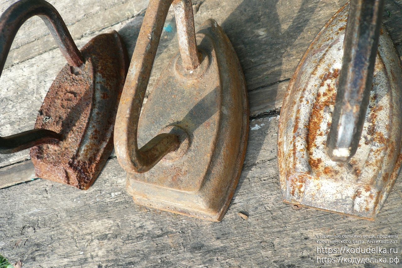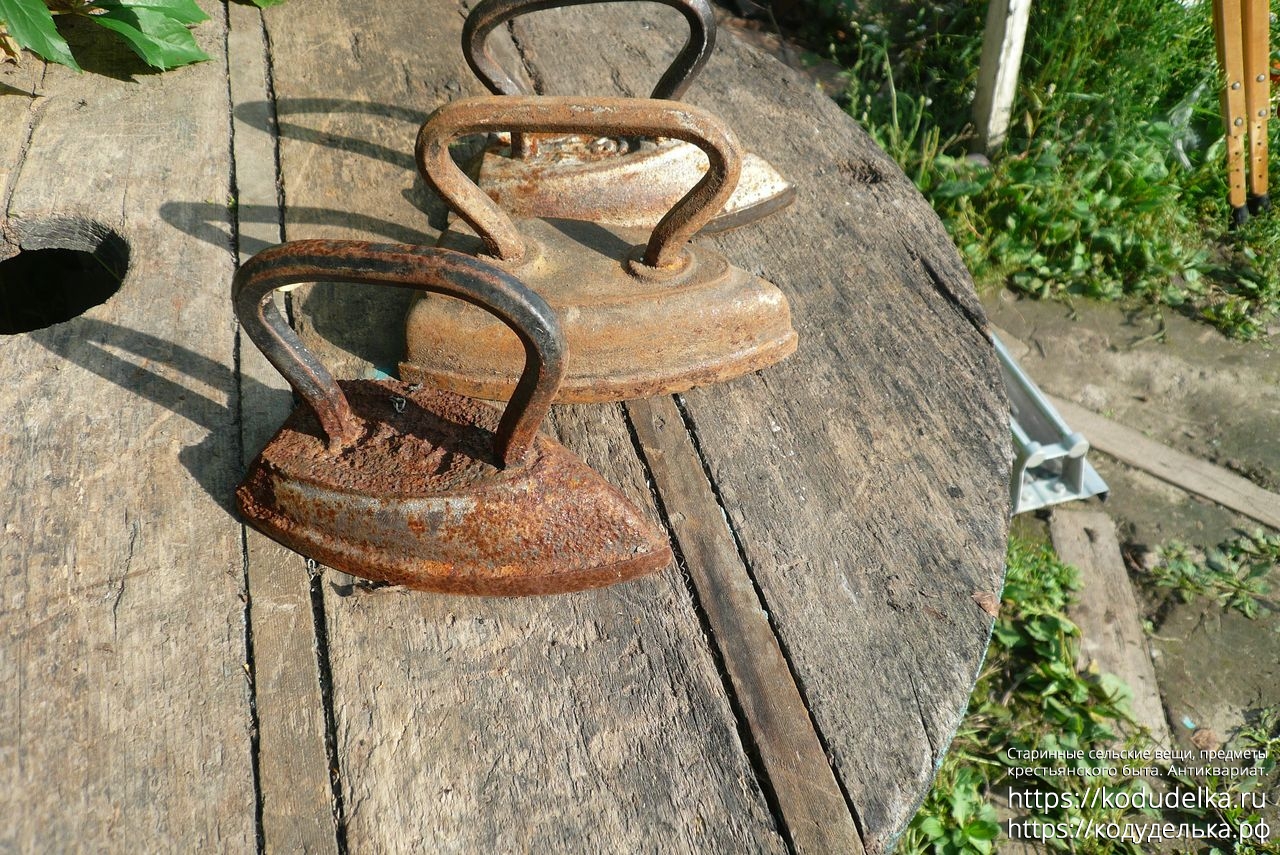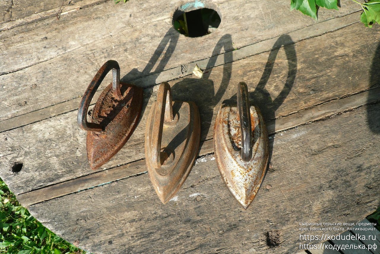 Утюг литой Серп и молот ржавый (крайний слева), №2 или №3 (из-за сильной заржавленности клейма — сложно различить)