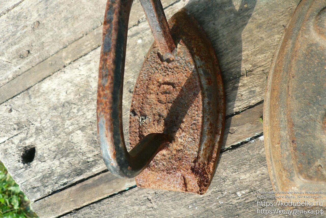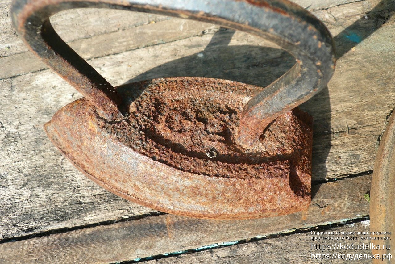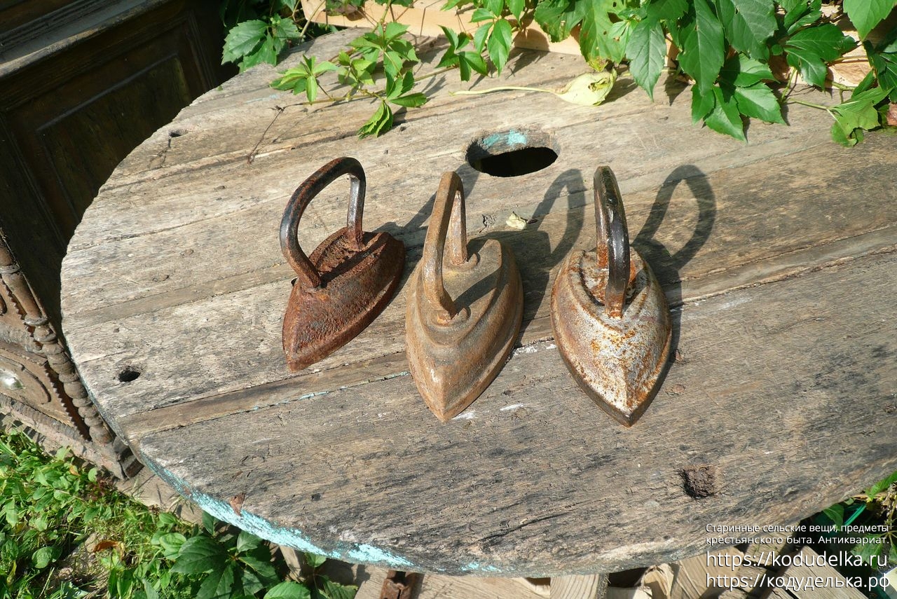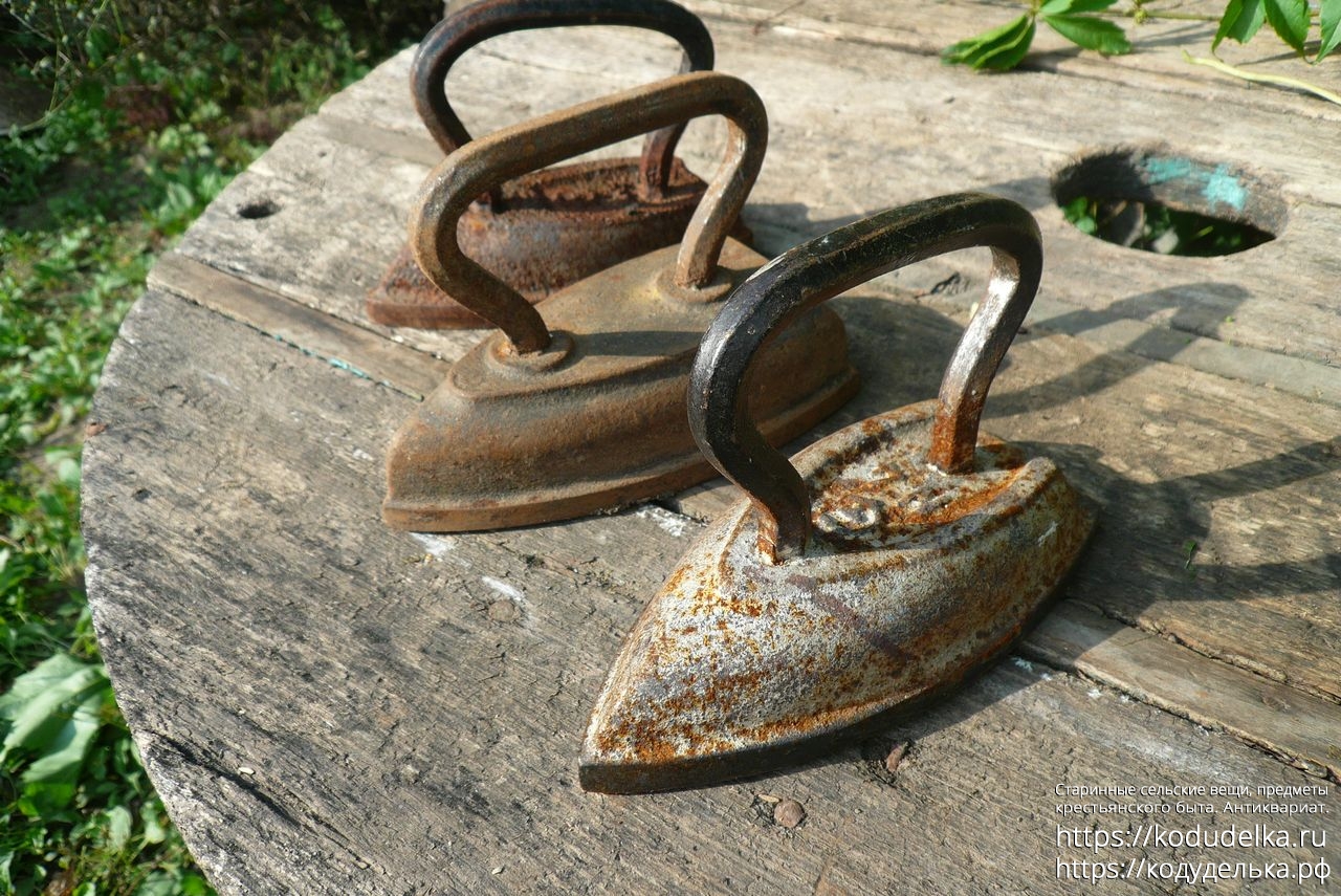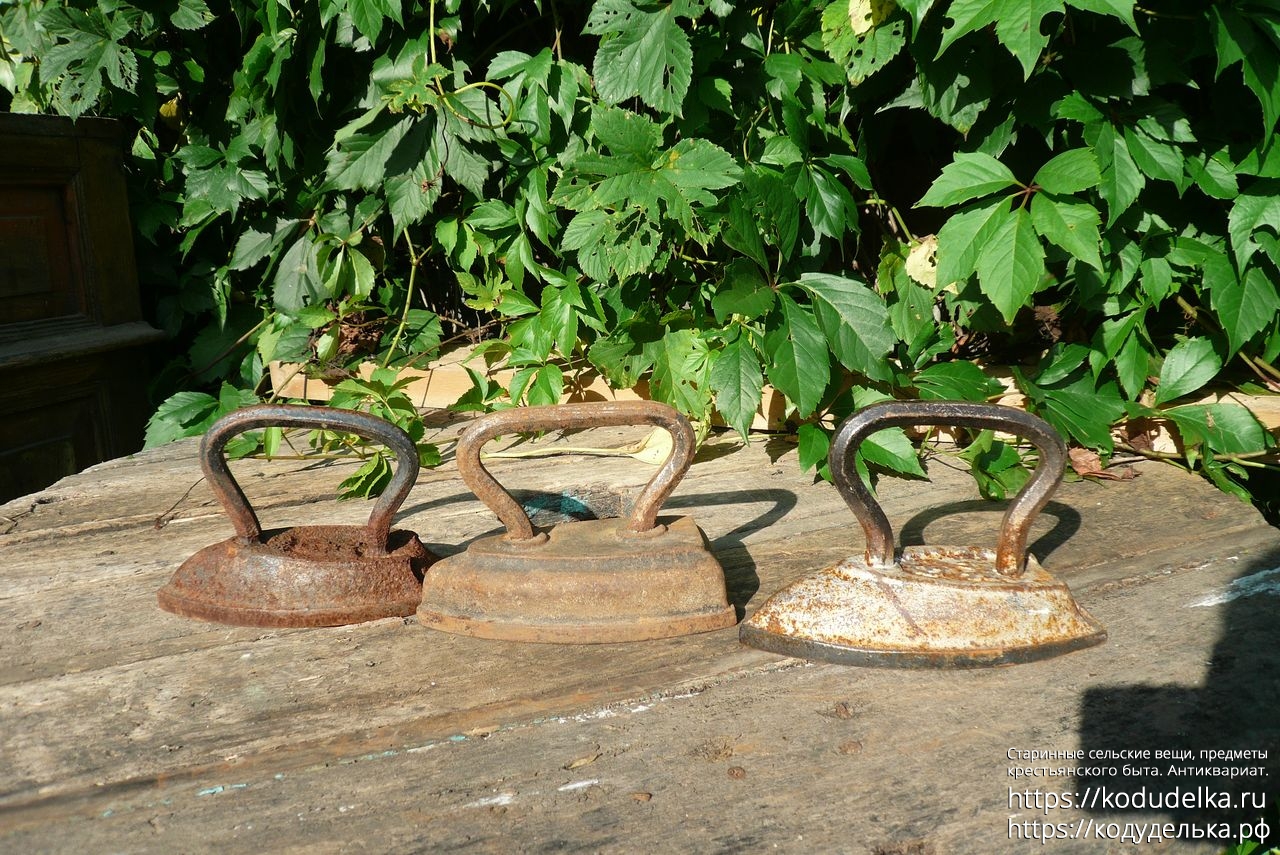 Утюг литой Серп и молот ржавый (крайний слева), №2 или №3 (из-за сильной заржавленности клейма — сложно различить)