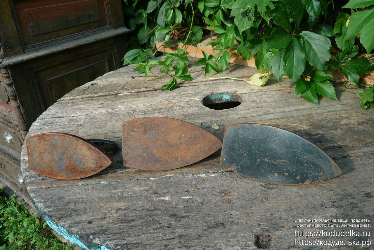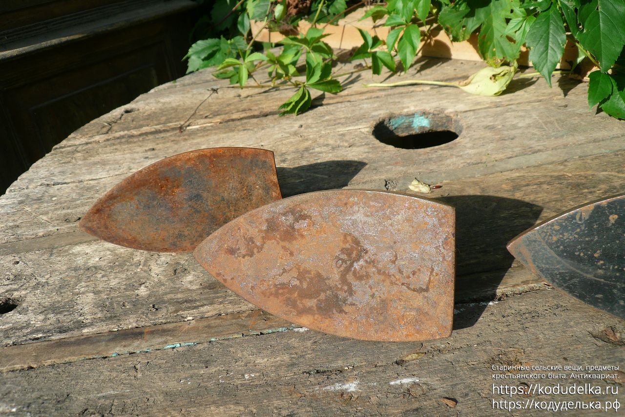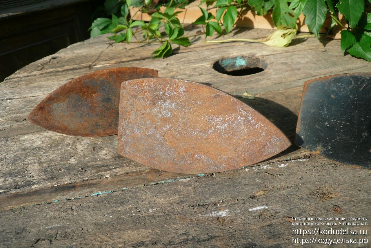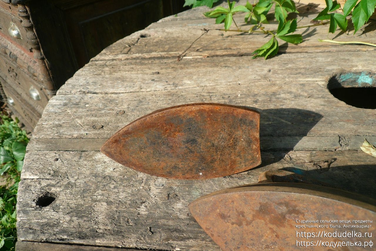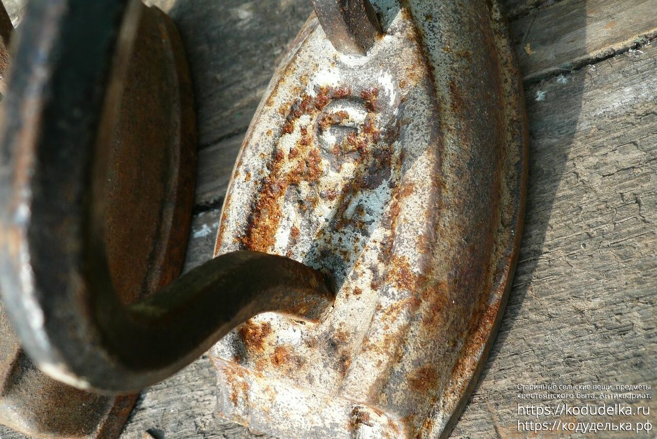Утюг литой Серп и молот ржавый (крайний слева), №2 или №3 (из-за сильной заржавленности клейма — сложно различить)