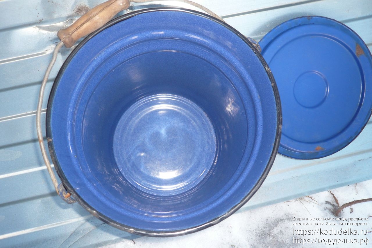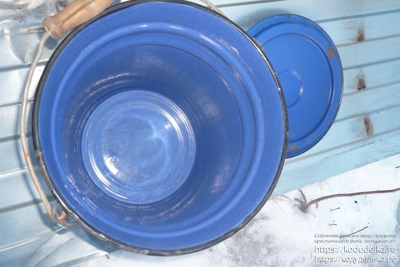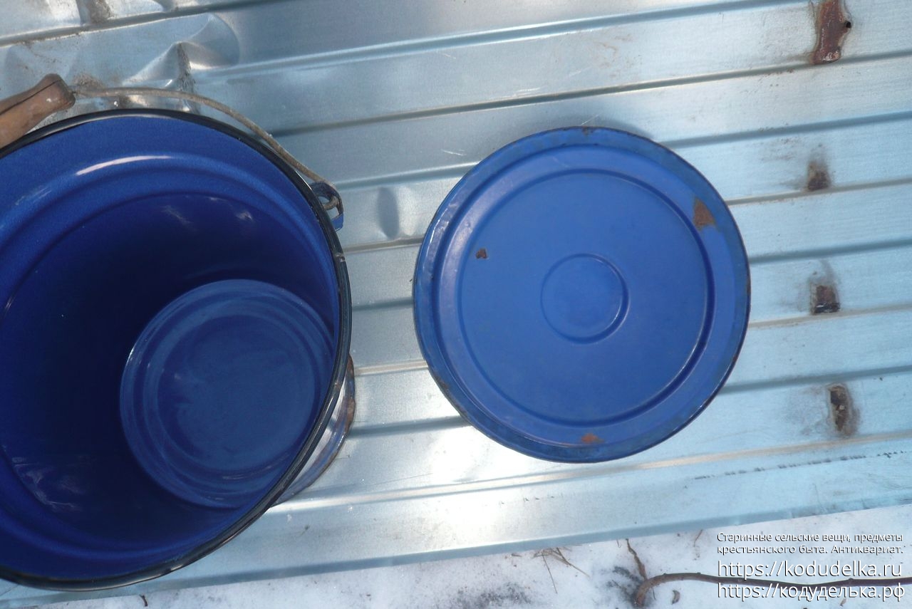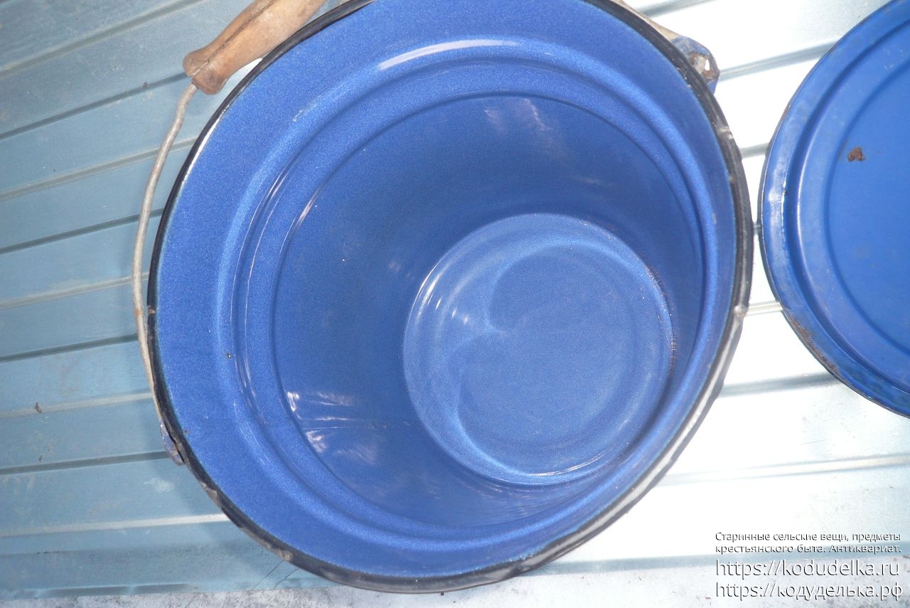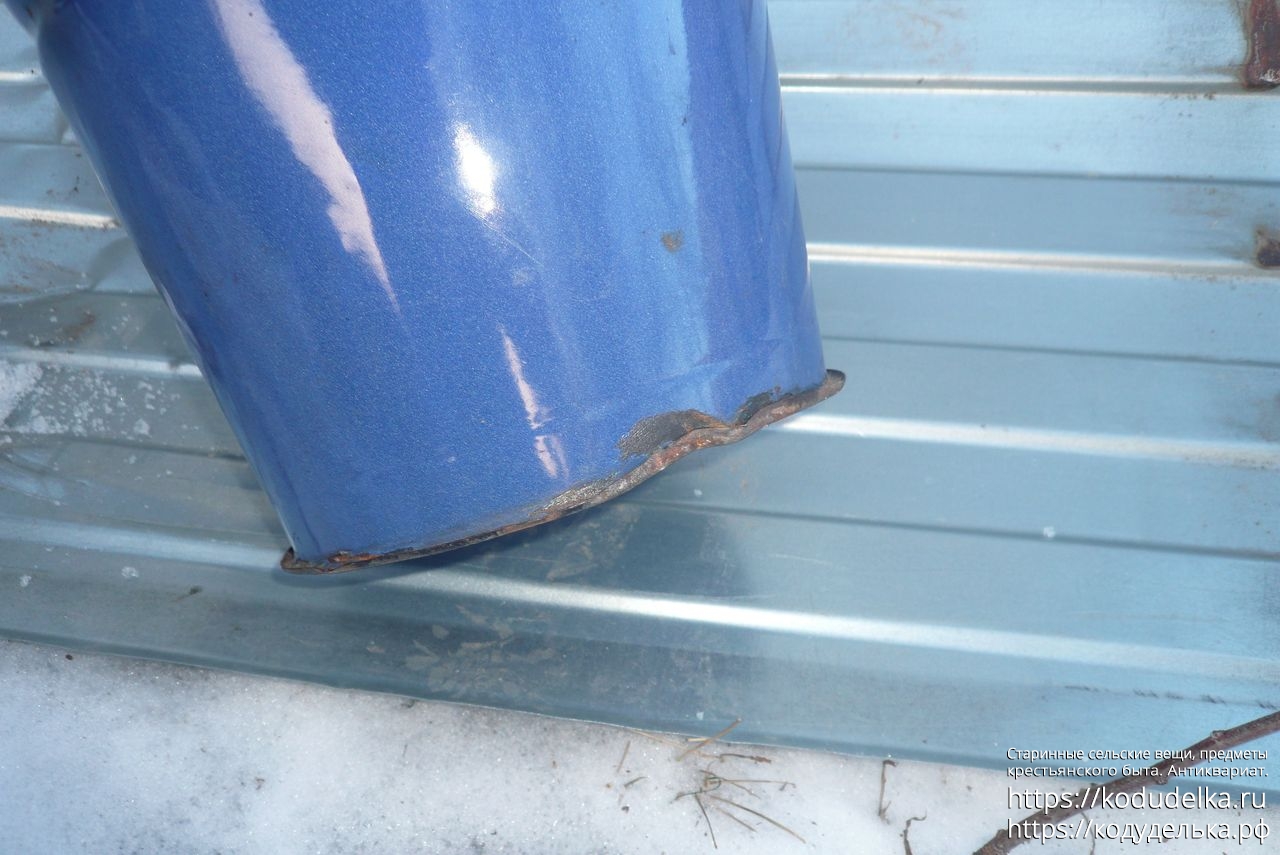 Приятная эмаль синего цвета. Снаружи есть небольшие сколы, особенно по нижнему ободку (который просто подставка, а не «тело» ведра. Внутри эмаль вся целая!