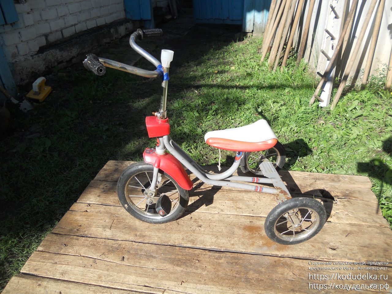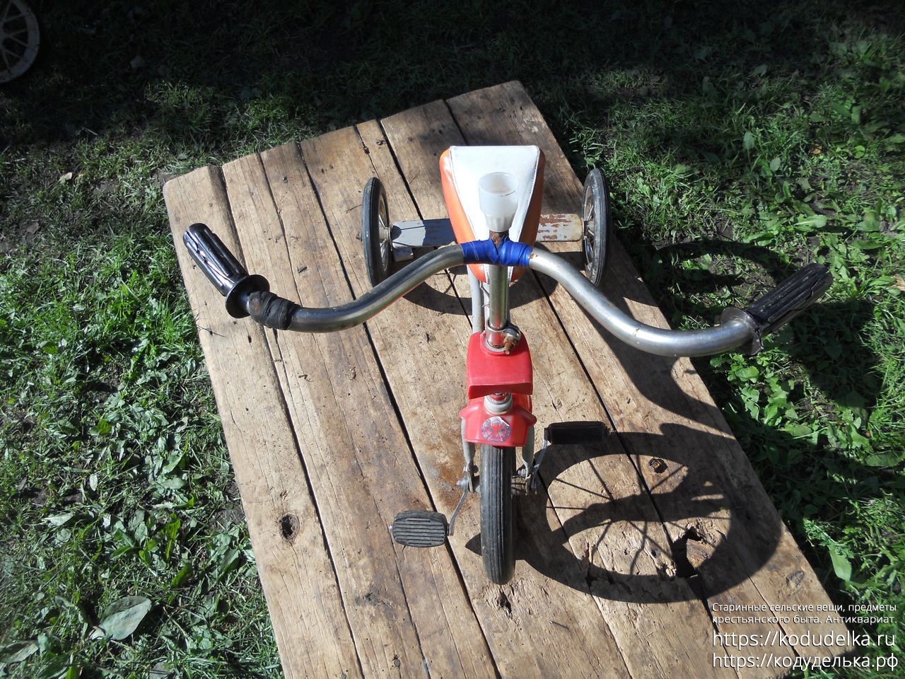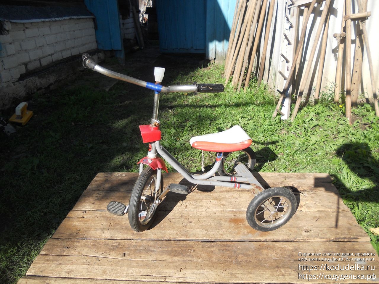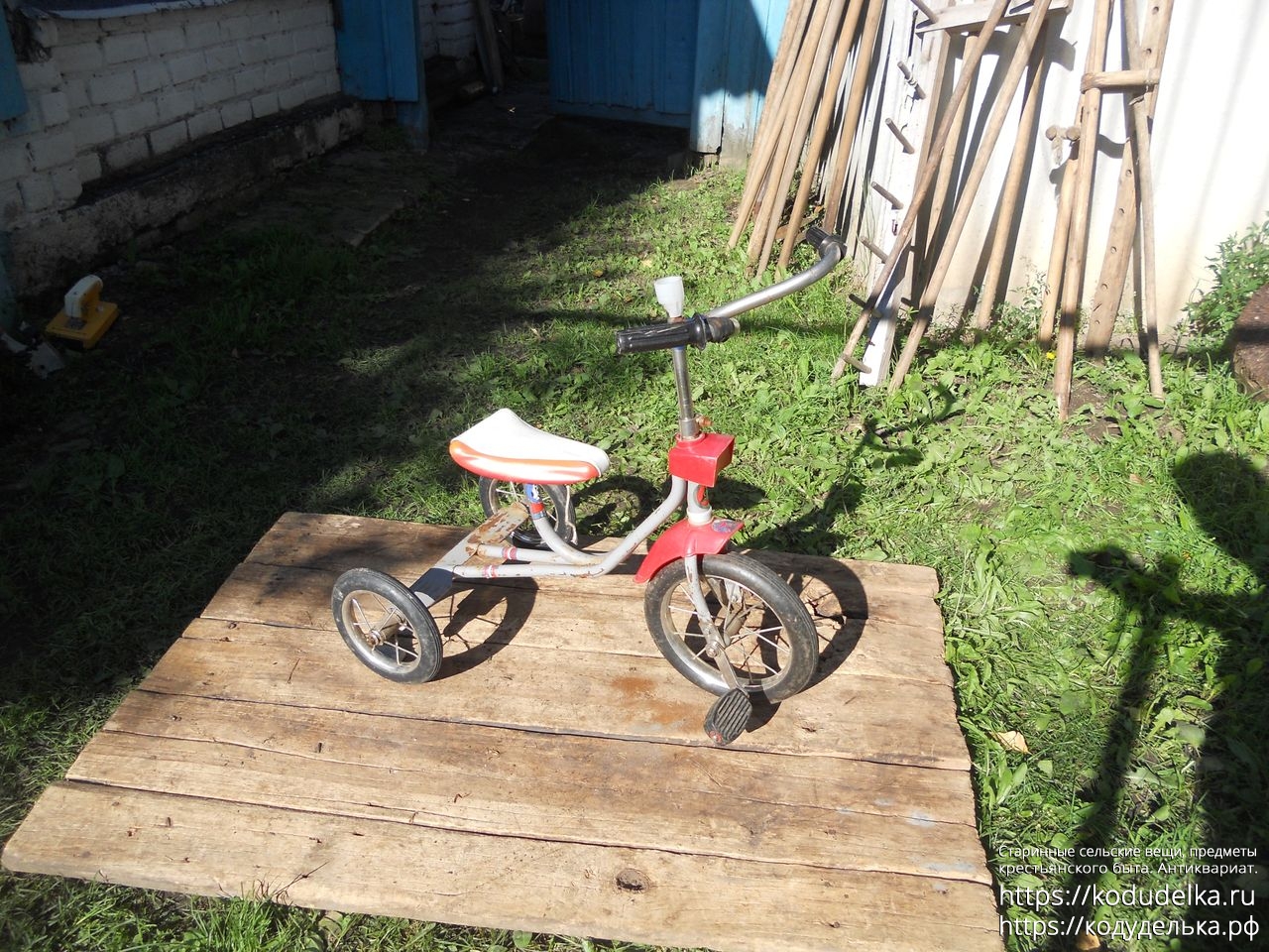 Советский детский трехколесный велосипед, модель определить не удалось, похожие есть по тэгам Пушок и Леопольд — но есть различия либо по седлам, либо по форме руля. Здесь у меня тоже нет гарантий, что седло родное, но выглядит органично.