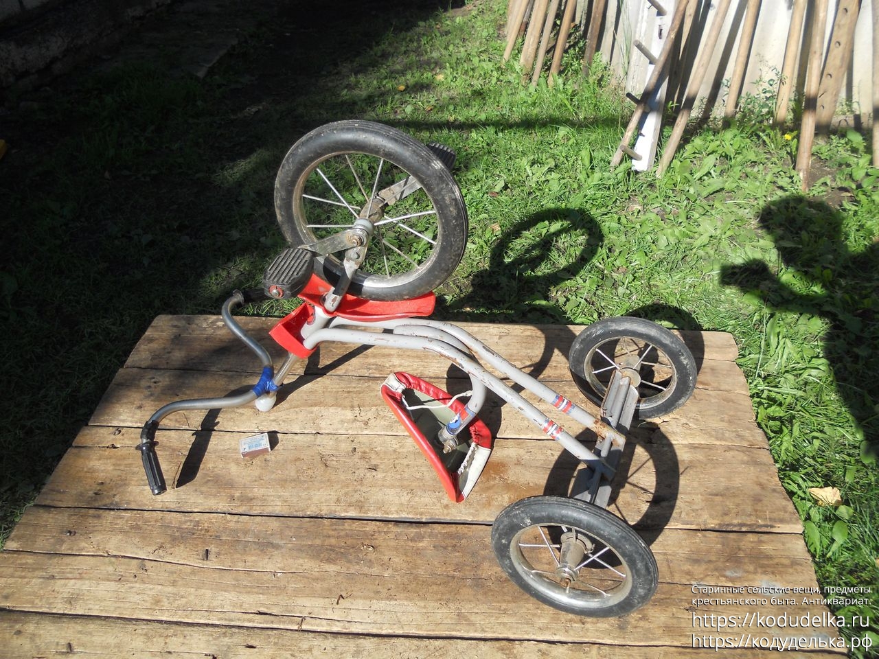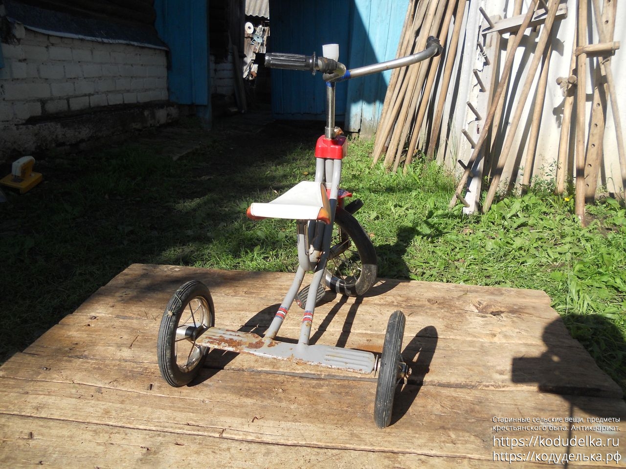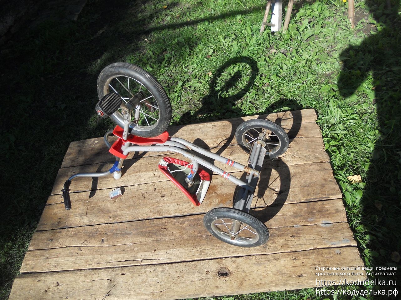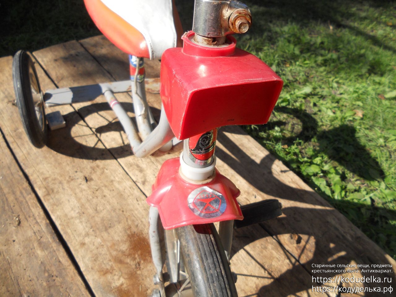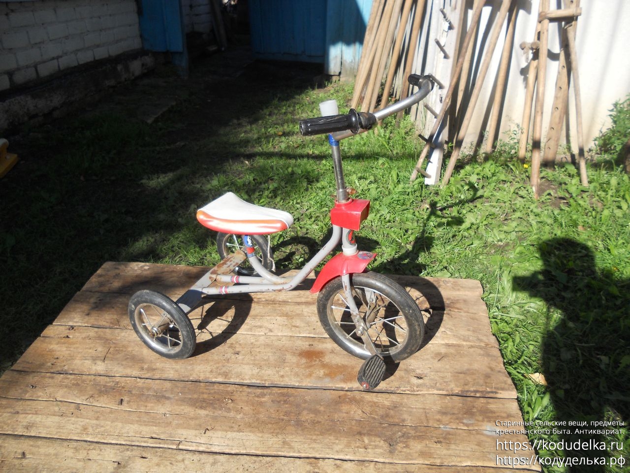 Советский детский трехколесный велосипед, модель определить не удалось, похожие есть по тэгам Пушок и Леопольд — но есть различия либо по седлам, либо по форме руля. Здесь у меня тоже нет гарантий, что седло родное, но выглядит органично.