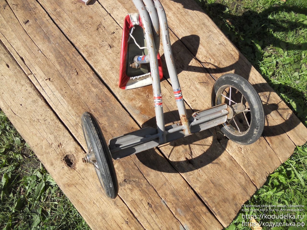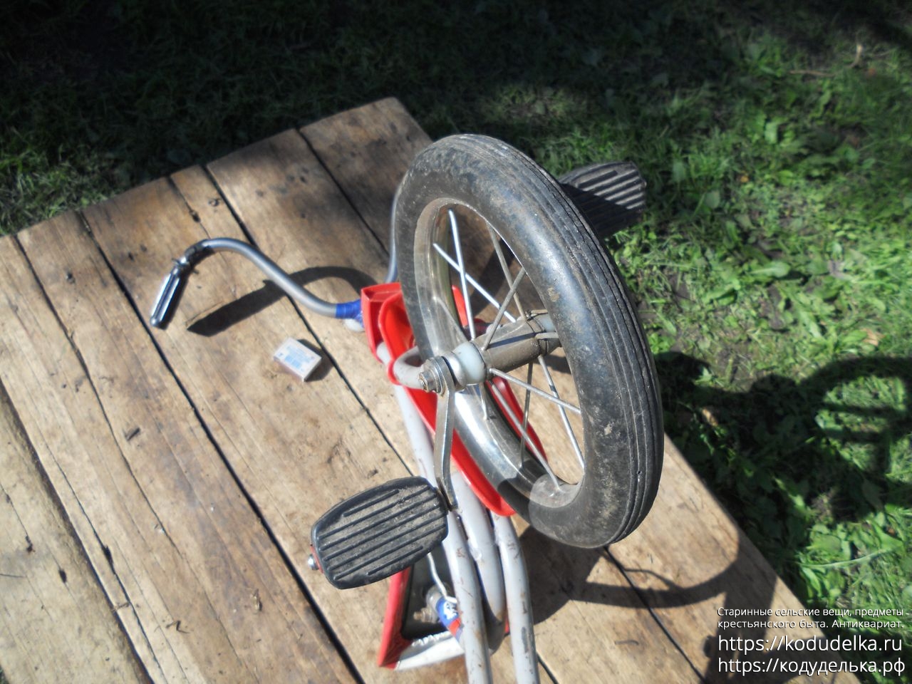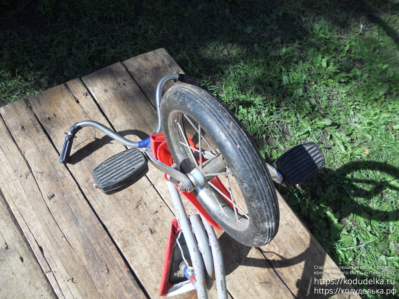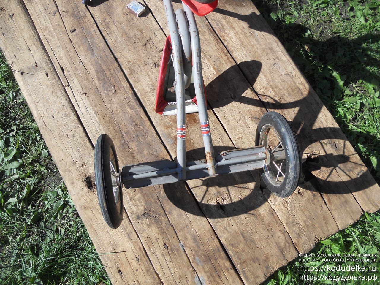 Советский детский трехколесный велосипед, модель определить не удалось, похожие есть по тэгам Пушок и Леопольд — но есть различия либо по седлам, либо по форме руля. Здесь у меня тоже нет гарантий, что седло родное, но выглядит органично.