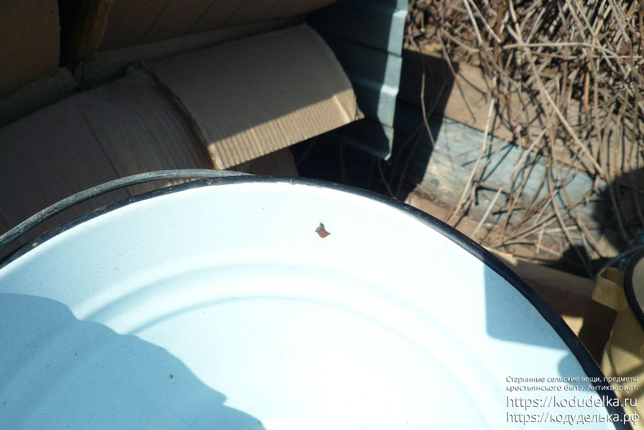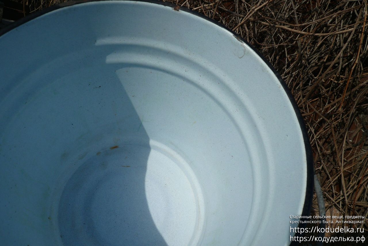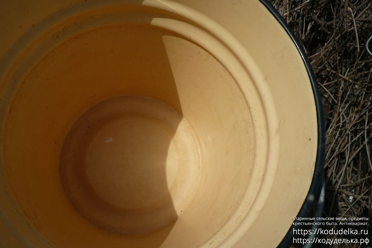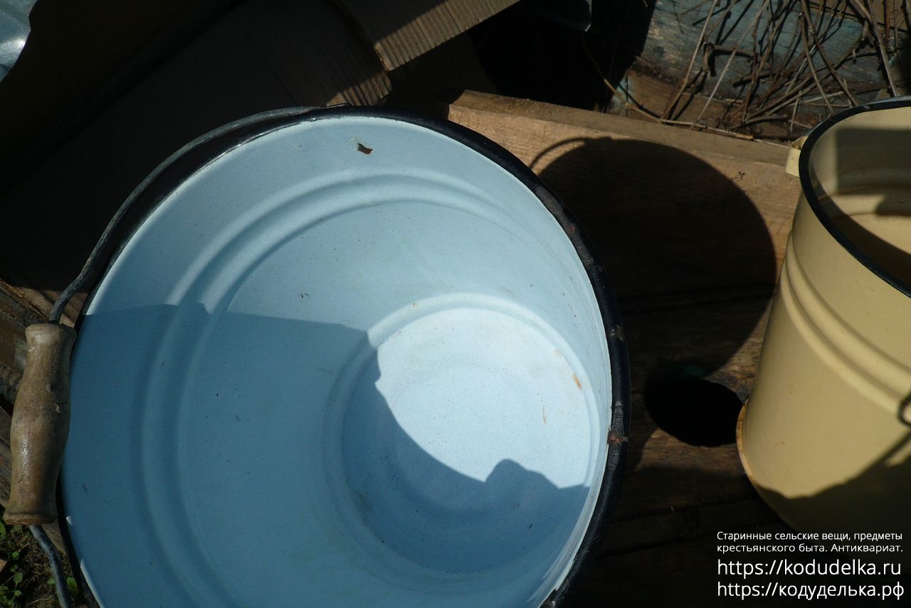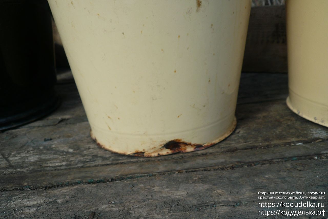 У одного светлого ведра есть сильный скол снаружи у дна — той части, которая подставка. Внутри эмаль целая