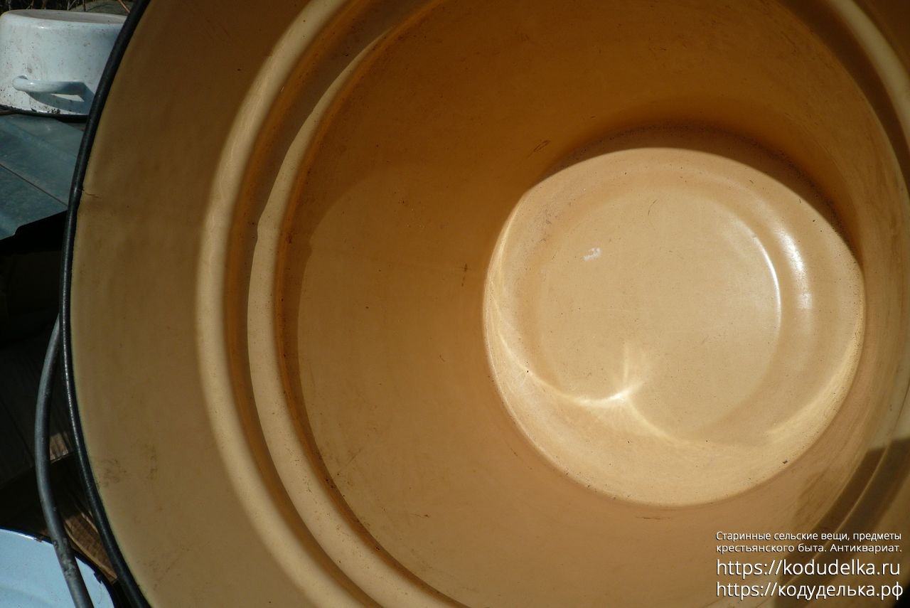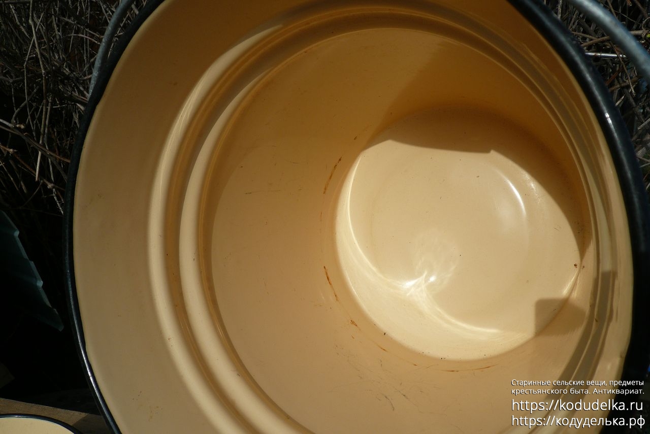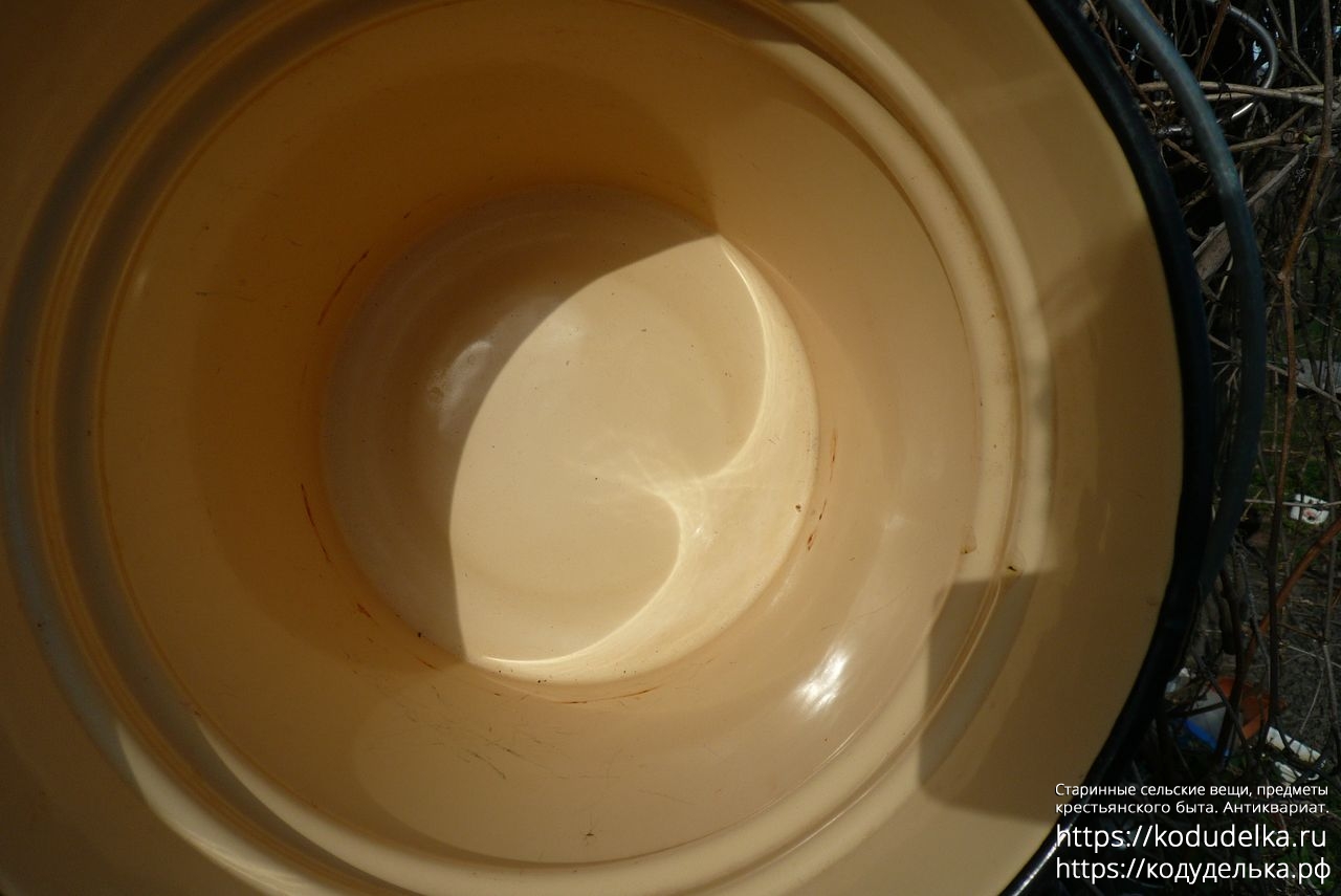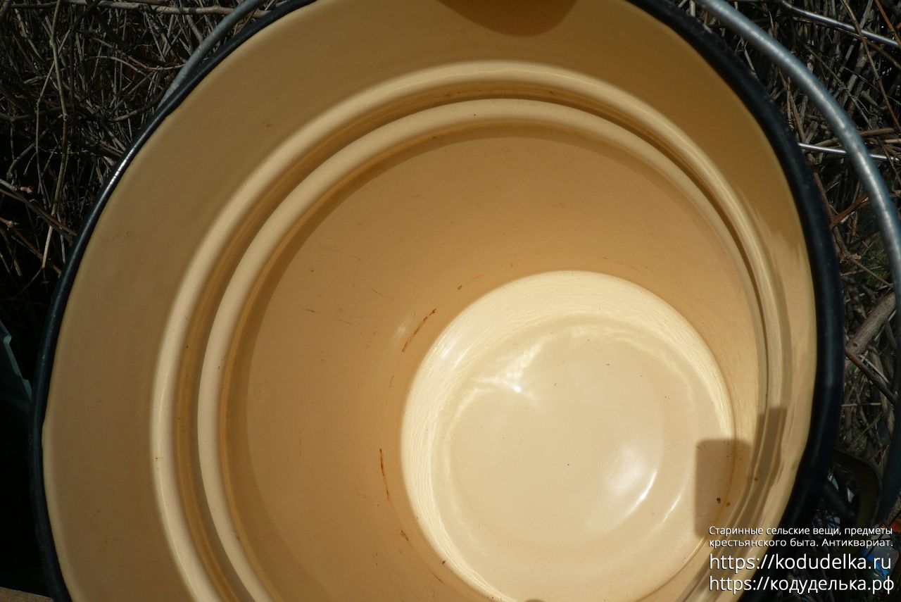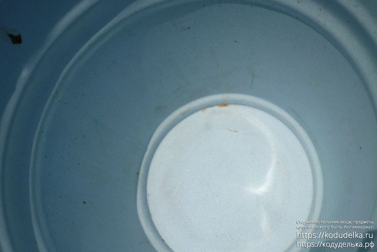 У одного светлого ведра есть сильный скол снаружи у дна — той части, которая подставка. Внутри эмаль целая