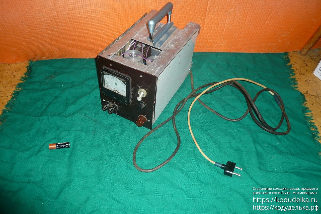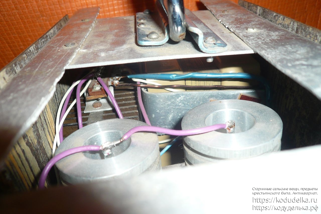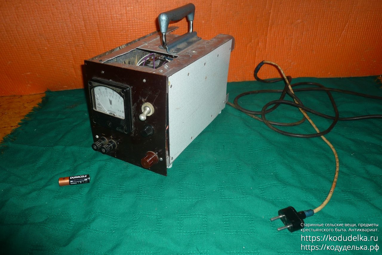 Люблю такие загадки)) Хотя, здесь все довольно просто. Выпрямитель (или блок питания, как нравится). Вот те огромные четыре круглые штуки — это радиаторы силовых диодов (и если хорошо посмотреть — последние как раз внутри). Четыре диода и собраны в мост. Плюс, хорошая подсказка (это, если бы диодный мост не видно) — указанный вольтметр, таки, под постоянный ток, который и получается на выходе. Но вообще, конструкция добротная. Думаю, можно довольно мощные потребители подключать.
