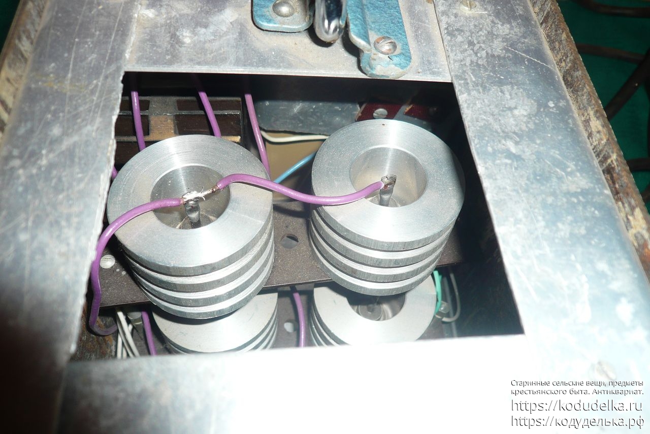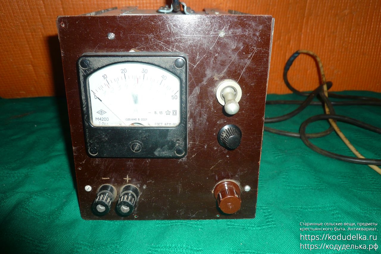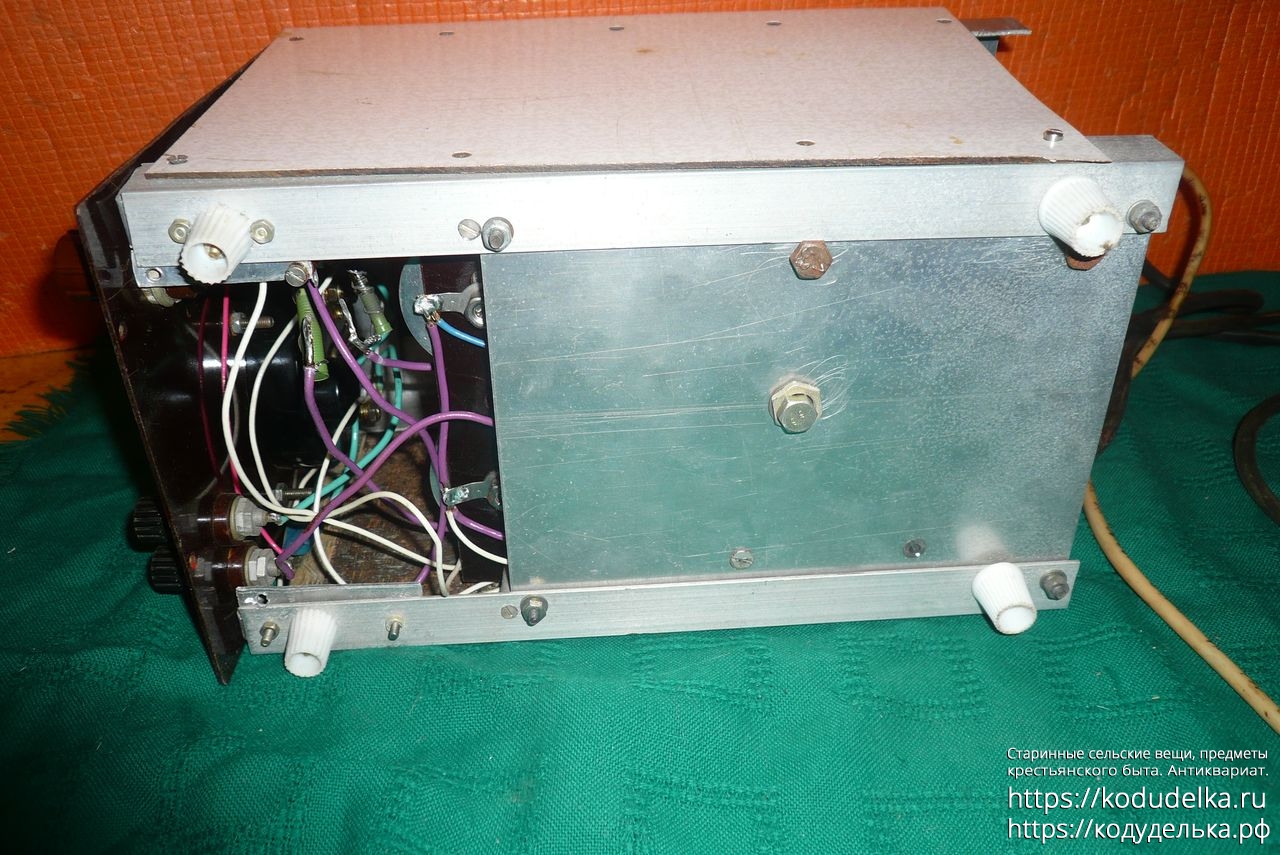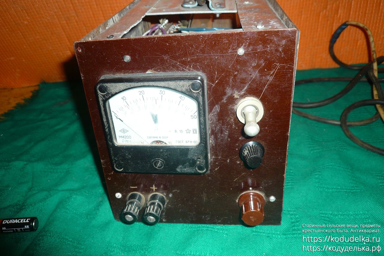 Выпрямитель (или блок питания). Четыре огромные круглые штуки — это радиаторы силовых диодов. Четыре диода и собраны в мост. Вольтметр М4200 под постоянный ток, который и получается на выходе.