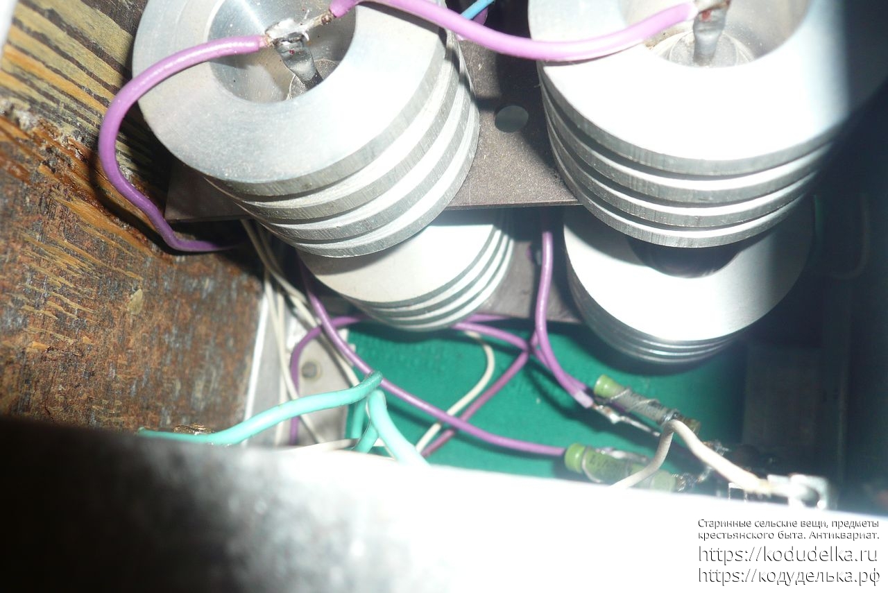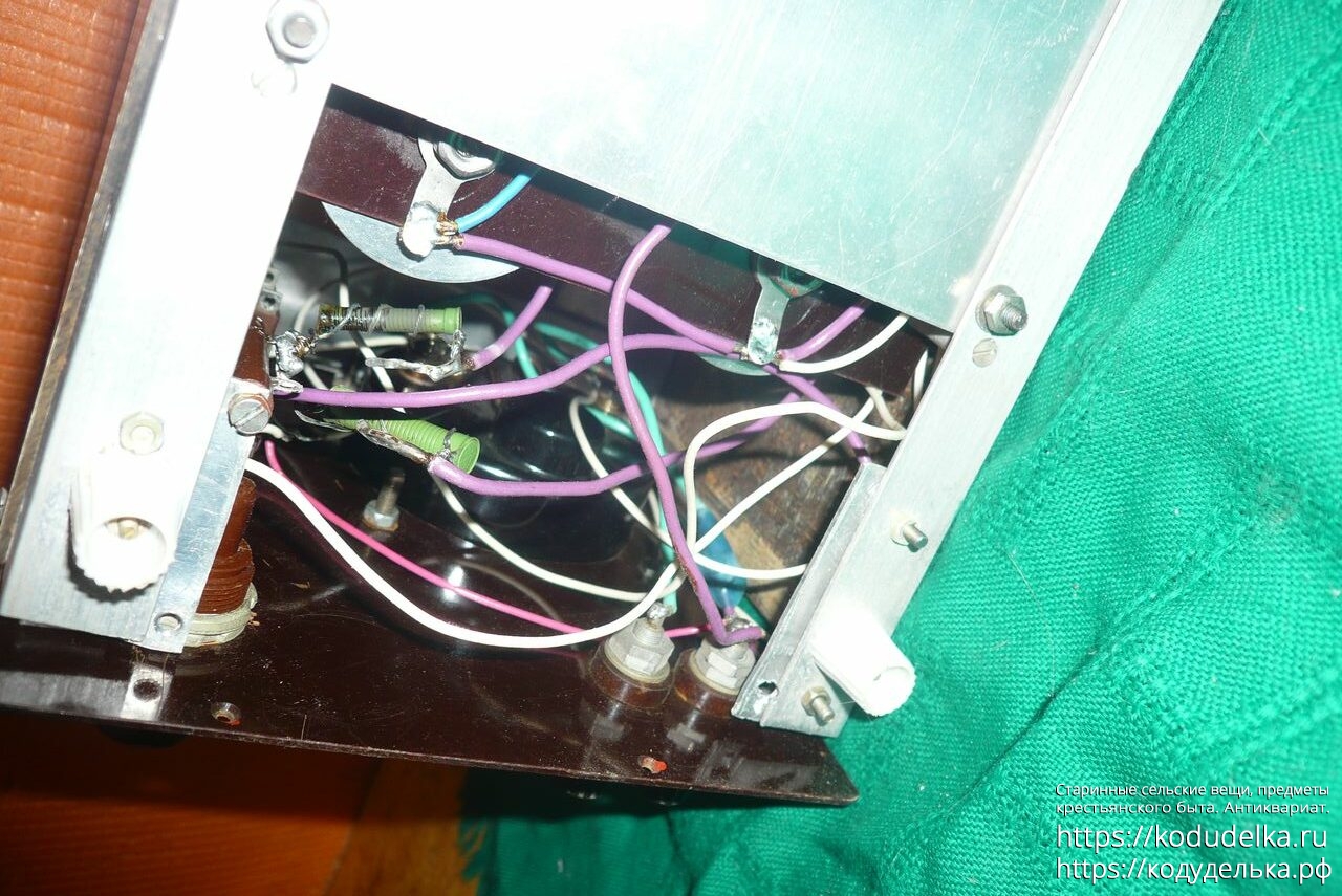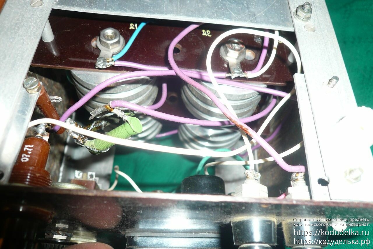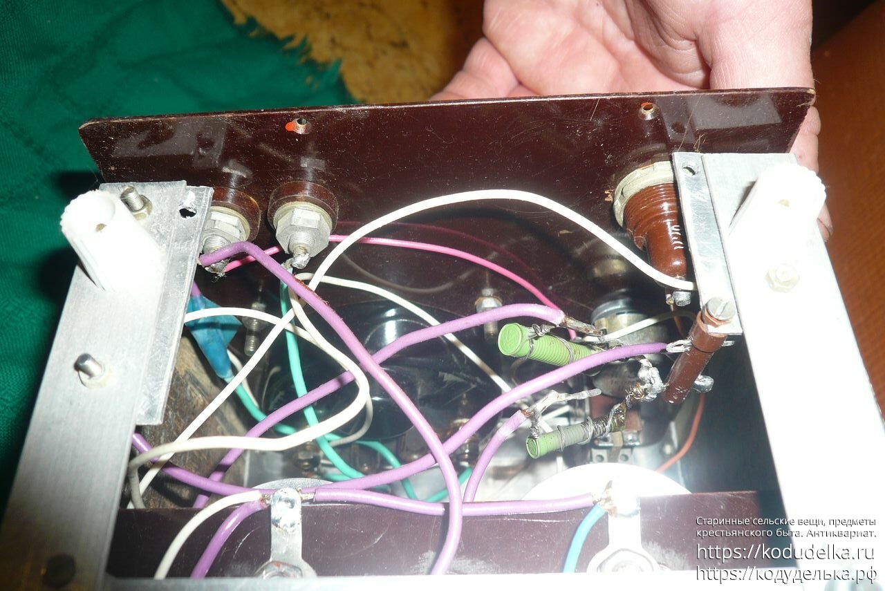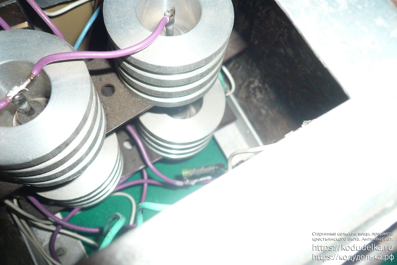 Выпрямитель (или блок питания). Четыре огромные круглые штуки — это радиаторы силовых диодов. Четыре диода и собраны в мост. Вольтметр М4200 под постоянный ток, который и получается на выходе.