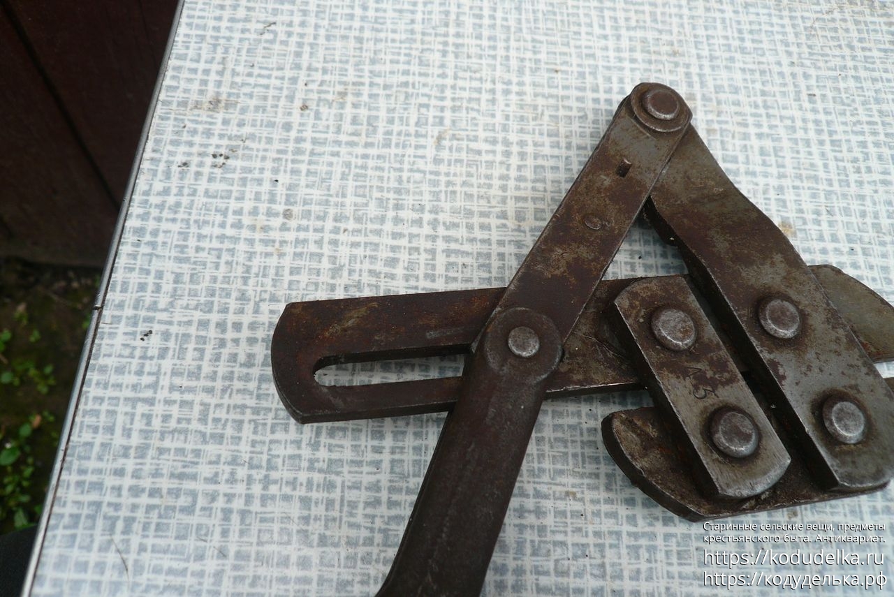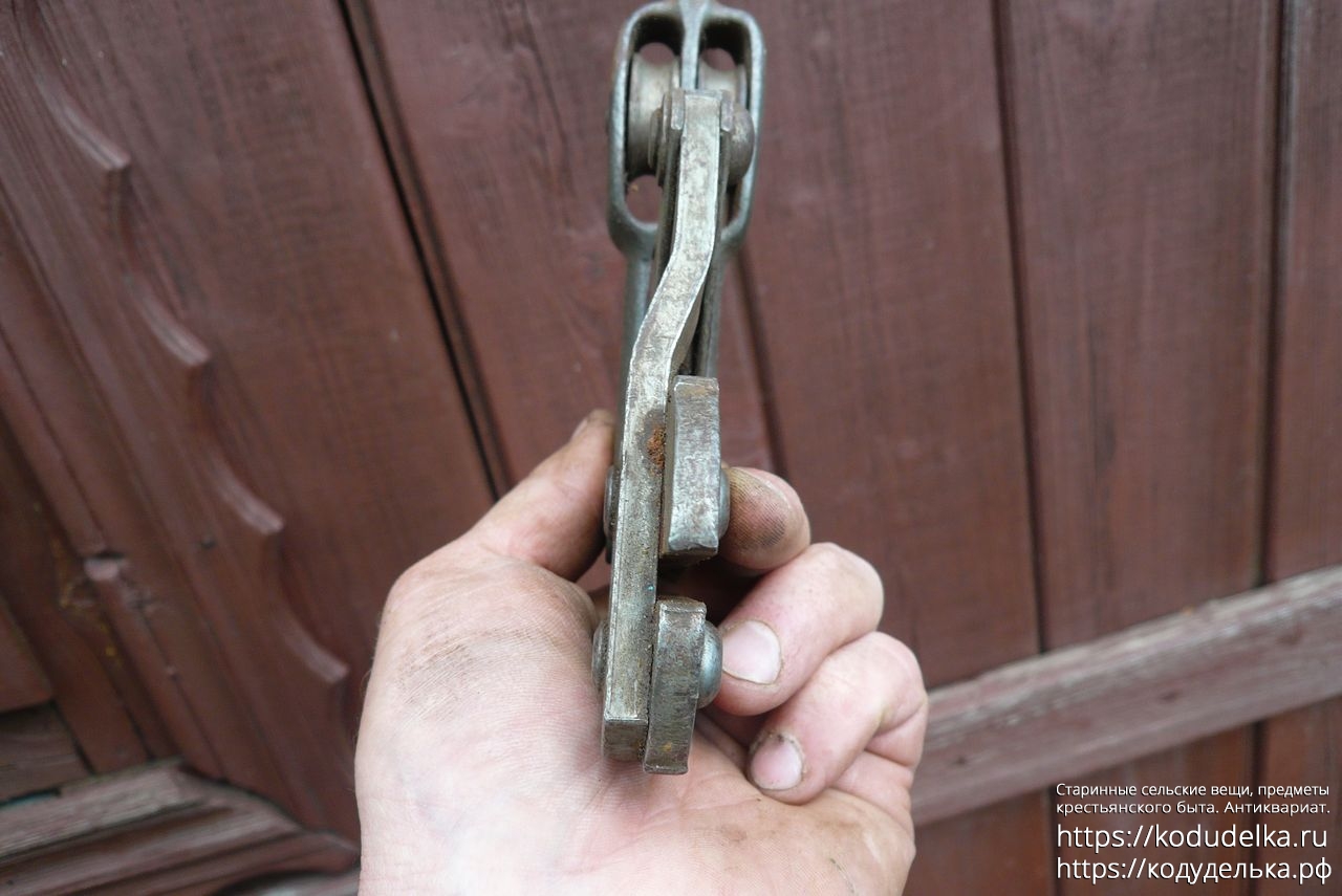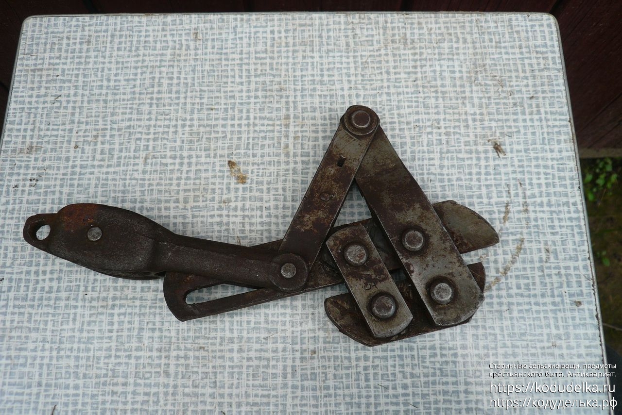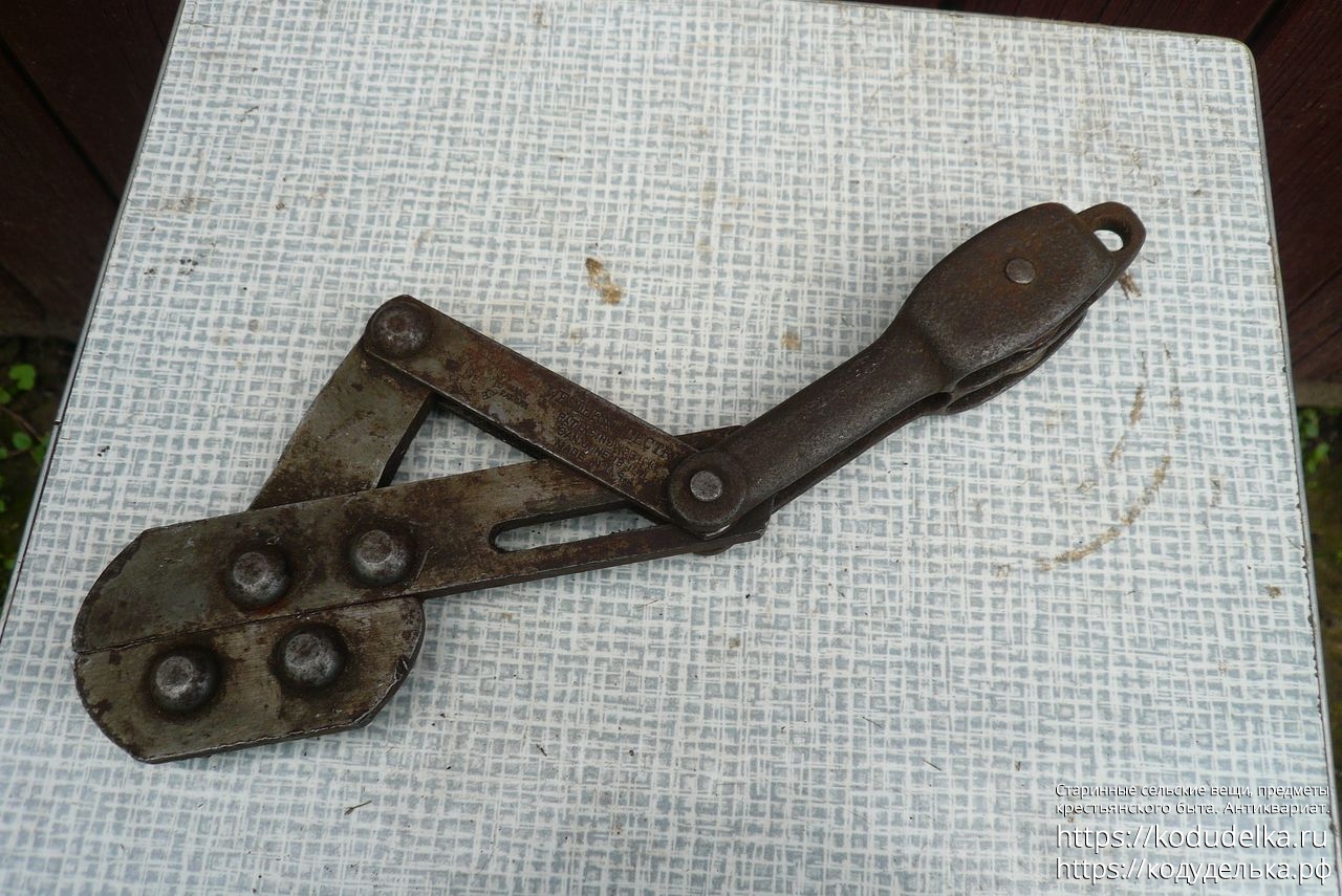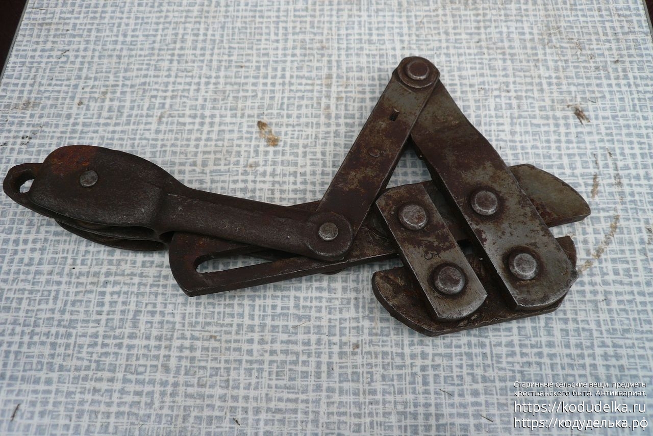 Максимально похоже это на современный монтажный зажим «лягушка», или же лапка для протяжки проволоки. Визуально — очень похоже, только на современных нет валиков в «рукоятке». В любом случае очень похоже на то, что эта штука для работы с кабелем или иной проволокой.